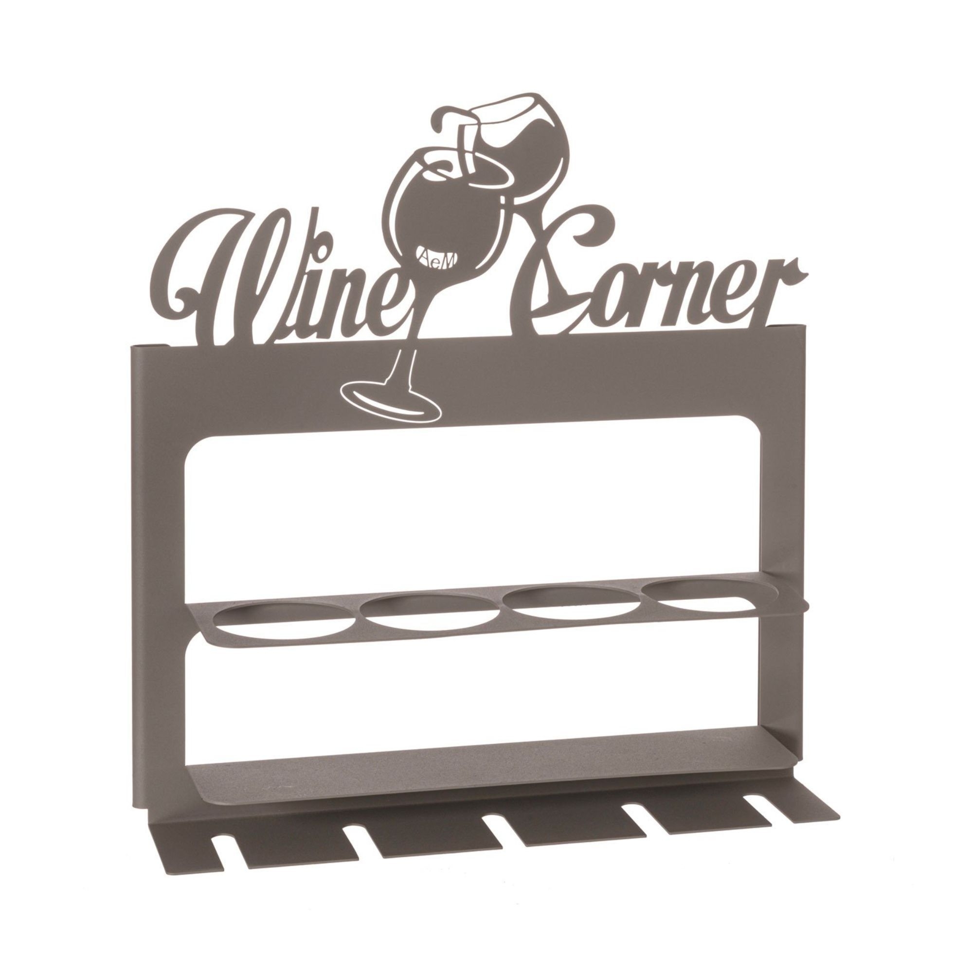 Wine Corner porta bottiglie realizzato in ferro. Wine Corner ha 4 posti per conservare le tue bottiglie di vino migliori e 5 posti per sistemare i calici. Si presenta come un rettangolo con una scritta e due calici per decorazione. Disponibile in tre finiture colore, Wine Corner è un porta bottiglie di design moderno irrinunciabile! Realizzato da Arti e Mestieri.