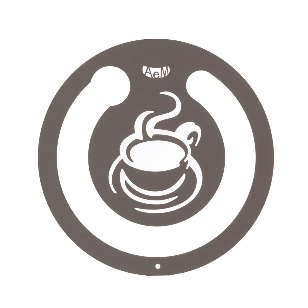 Round coffee capsule holder made of powder coated iron and epoxy. It features decorations of a steaming cup of coffee and a teaspoon. Available in three colors, it is decorative but at the same time functional, as it allows you to insert coffee capsules in our kitchen furniture, without sacrificing style. Made by Arti e Mestieri.