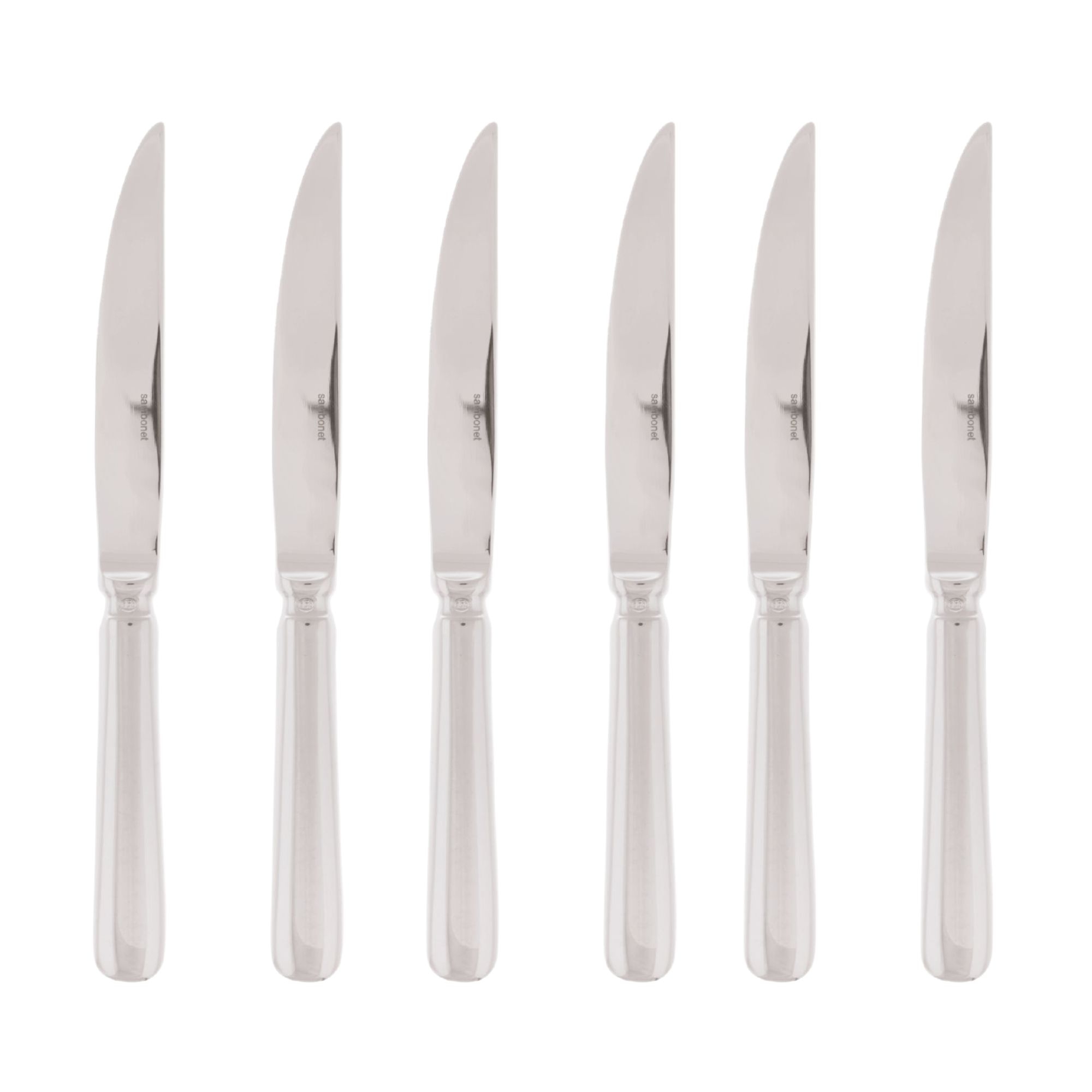 Baguette 6 steak/pizza knives made of stainless. Available in mat stainless steel or vintage steel, Baguette steak/pizza knife has an ergonomic handle, which guarantees an easy handle and extreme resistance. Perfect for slicing meat in a practical way, Baguette knives will bring to the table all the elegance and style of the typical cutlery of the '900. Projected by Sambonet.