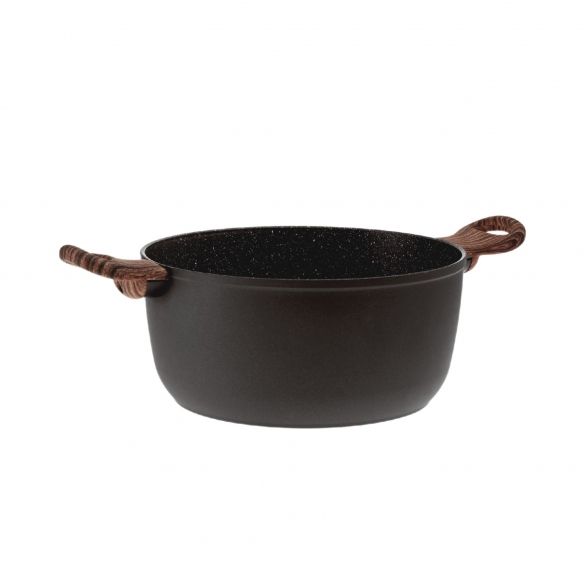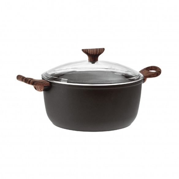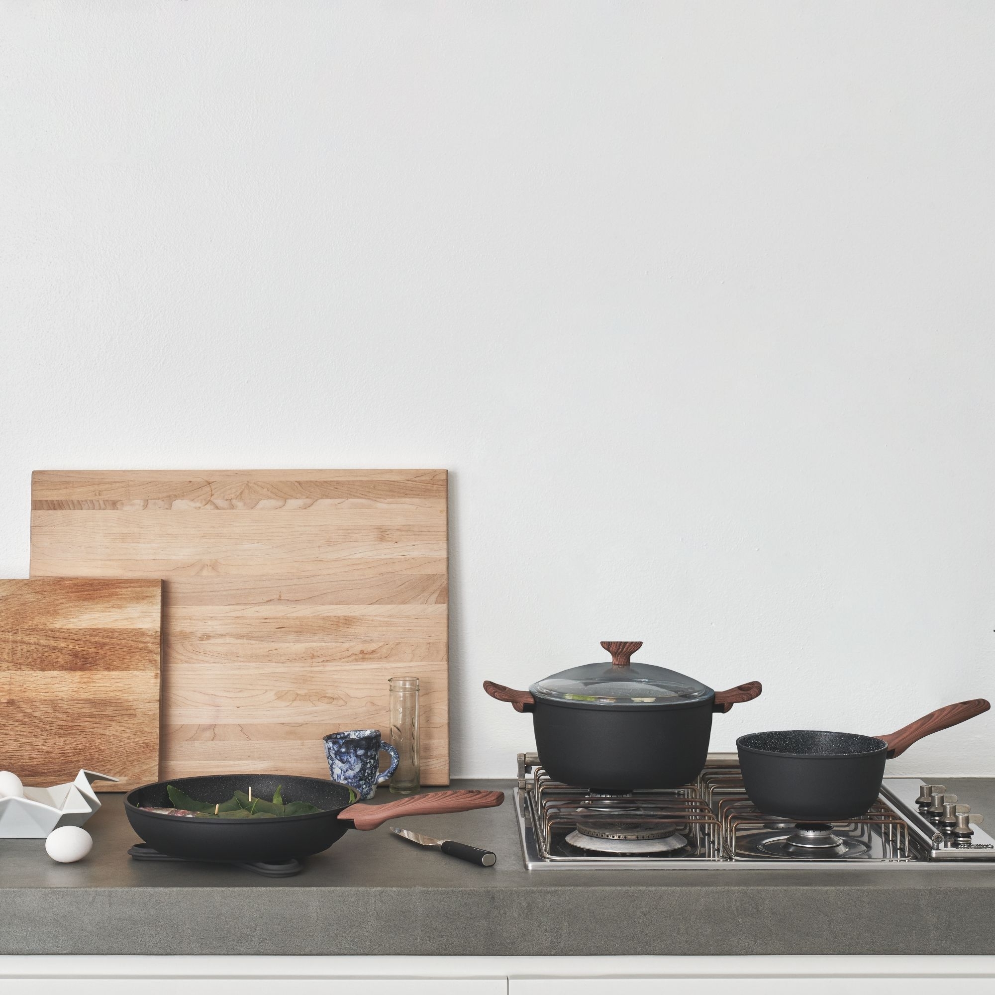 Saucepot with two handles with a diameter of 24 cm, belonging to the Rock ‘N’ Rose collection, made of aluminium, with the ‘Quarzotek’ five-layer mineral non-stick coating and glass lid. Available in two elegant colours (black and soft rose), the Rock ‘N’ Rose saucepot stands out for its simple and compact design, enriched by the fabulous stone-effect texture of the internal coating. The handles are ergonomic and soft-touch and are characterized by an elegant wood finish. Ideal for both low and high-flame cooking, the Rock ‘N’ Roll saucepot guarantees professional performances. Suitable for induction use. Designed and projected by Sambonet.
