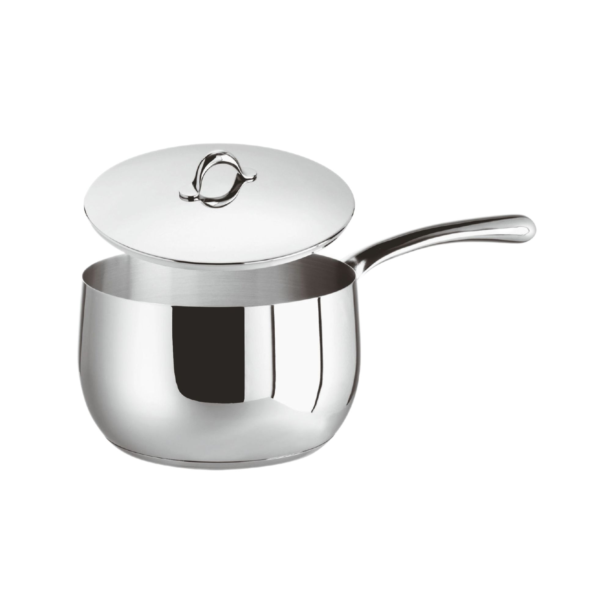Saucepan with lid, with 14 cm of diameter, belonging to the Kikka collection, made of 18/10 stainless steel. Ideal for the preparation of sauces, gravy, mix food, and so on, the Kikka sock pot is suitable for all types of cooking, including induction thanks to the metallic steel bottom. The design is very simple, characterized by compact and regular lines, but at the same time out of the ordinary. The superior quality steel guarantees durability over time, as it is very resistant to scratches and wear. Designed and built by Sambonet.