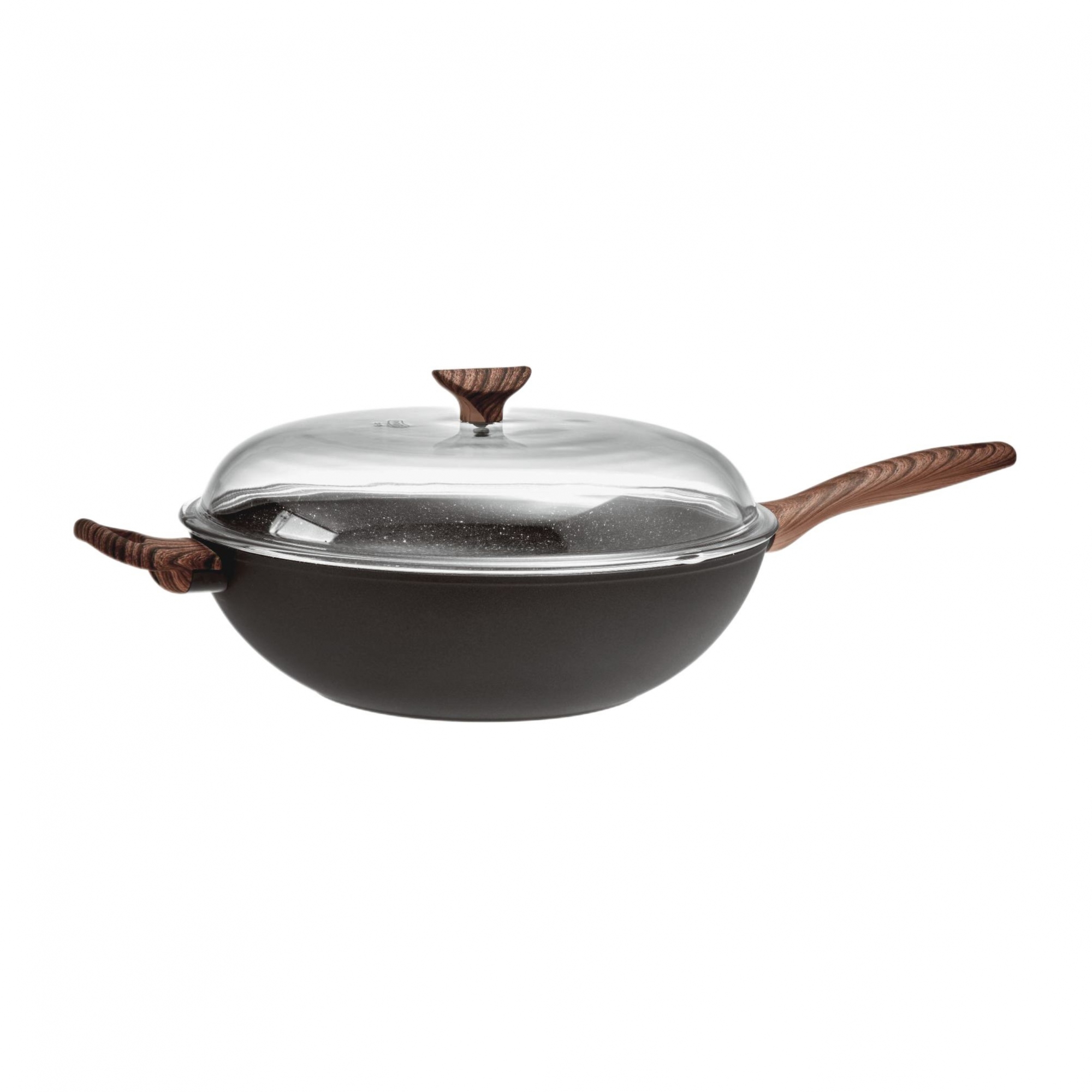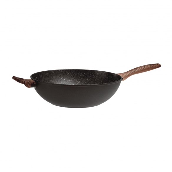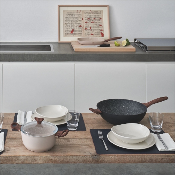 Wok with two handles and a diameter of 32 cm, belonging to the Rock ‘N’ Rose collection, made of aluminium, with the ‘Quarzotek’ five-layer mineral non-stick coating and glass lid. Available in two elegant colours (black and soft rose), the Rock ‘N’ Rose wok stands out for its simple and compact design, enriched by the fabulous stone-effect texture of the internal coating. The handles are ergonomic and soft-touch and are characterized by an elegant wood finish. Ideal for both low and high-flame cooking, the Rock ‘N’ Roll wok guarantees professional performances. Suitable for induction use. Designed and projected by Sambonet.