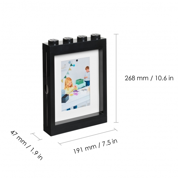 Photo frame, made of PVC plastic. It is available in 4 different colors, the design is inspired by the historic colored bricks, you can highlight your favourite photos with style! They are compatible with min-ifigure showcases, and are deep enough to hold small Lego® figures. You can choose to hang it on the wall or simply place it on tables or shelves. A perfect accessory for any room in your home! Ideal for all photo formats. Designed and made by Lego®.