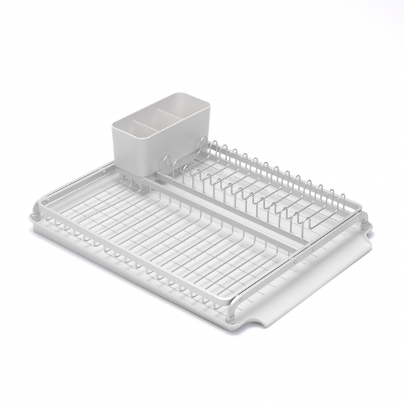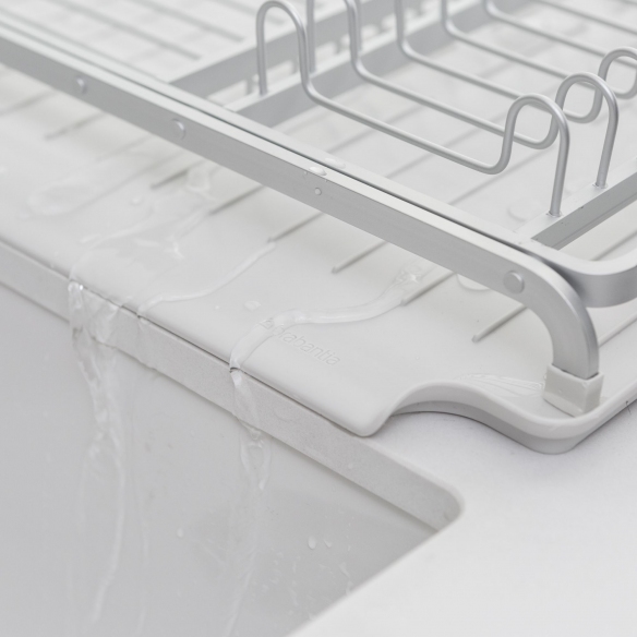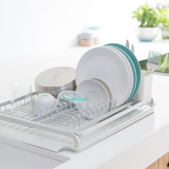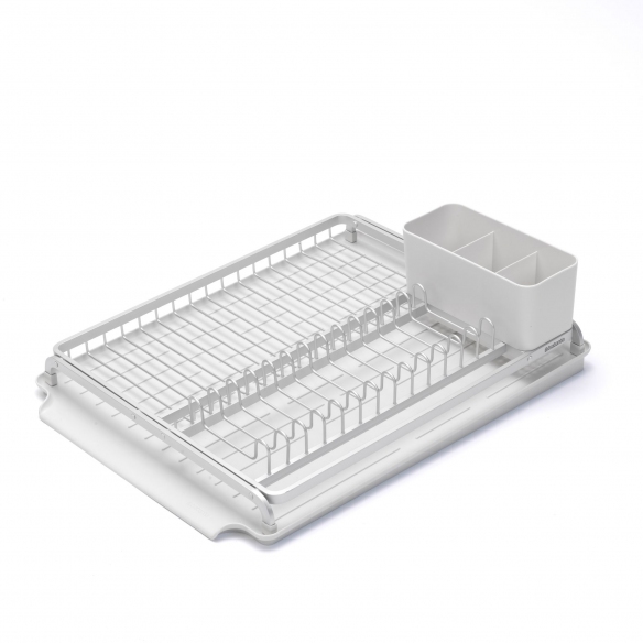 Compact dish drainer from the Sink Side collection, made of plastic. Available in 2 versatile color finishes, the Sink Side dish drainer is designed to ensure maximum performance every time. It has space for 13 dishes besides bowls, cutleries and glasses. has a removable cutlery basket and an inclined drip tray, which pours excess water directly into the sink. Designed and made by Brabantia.
