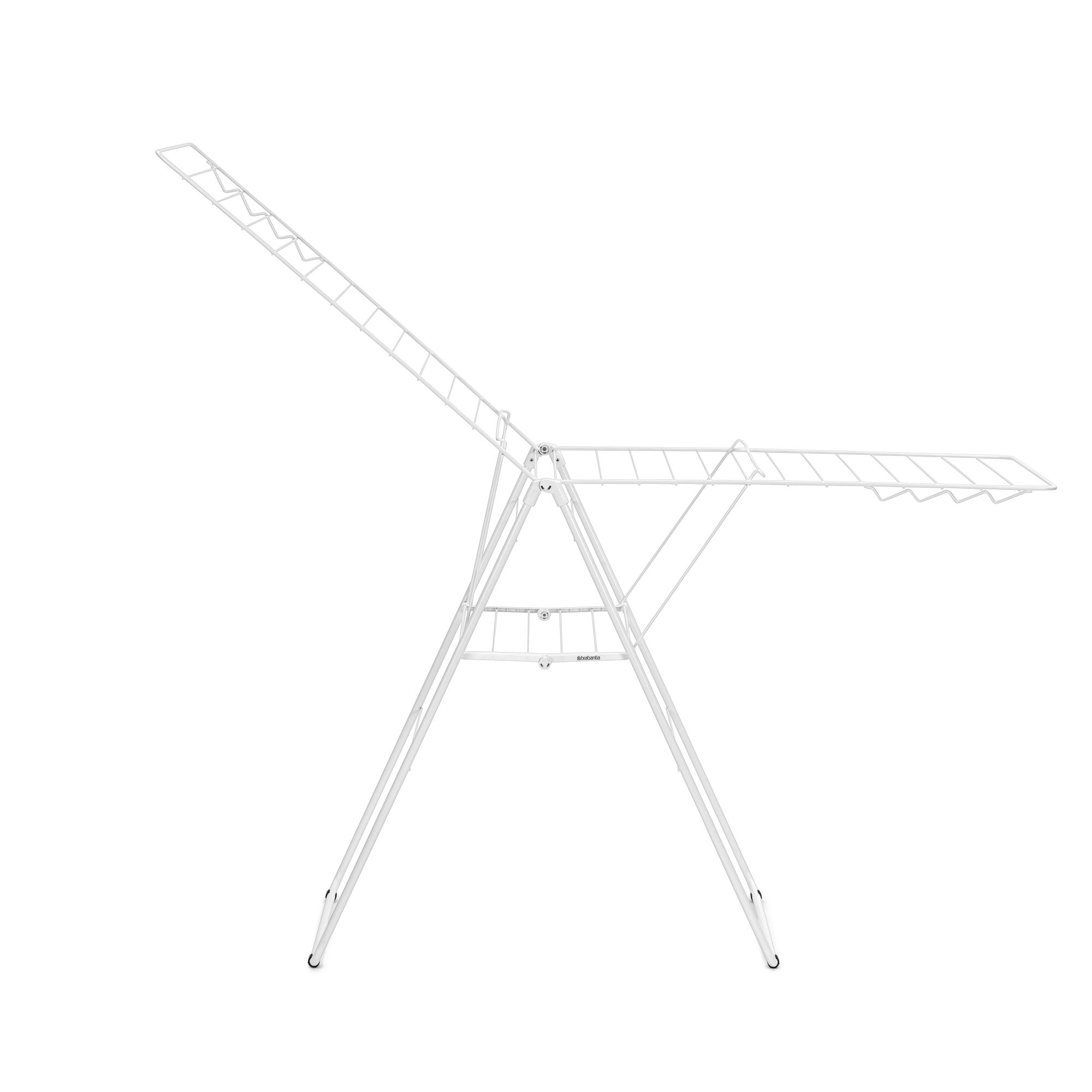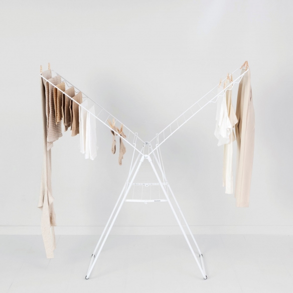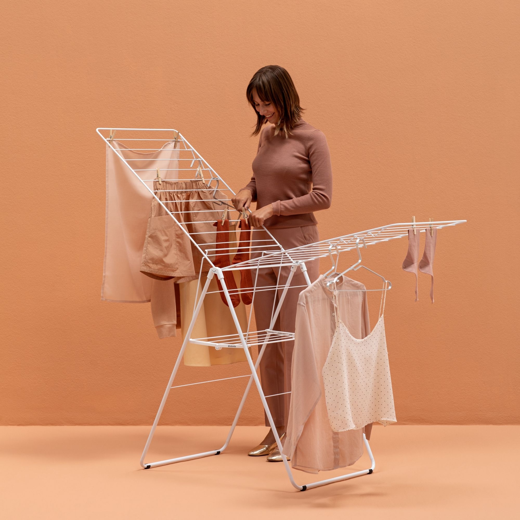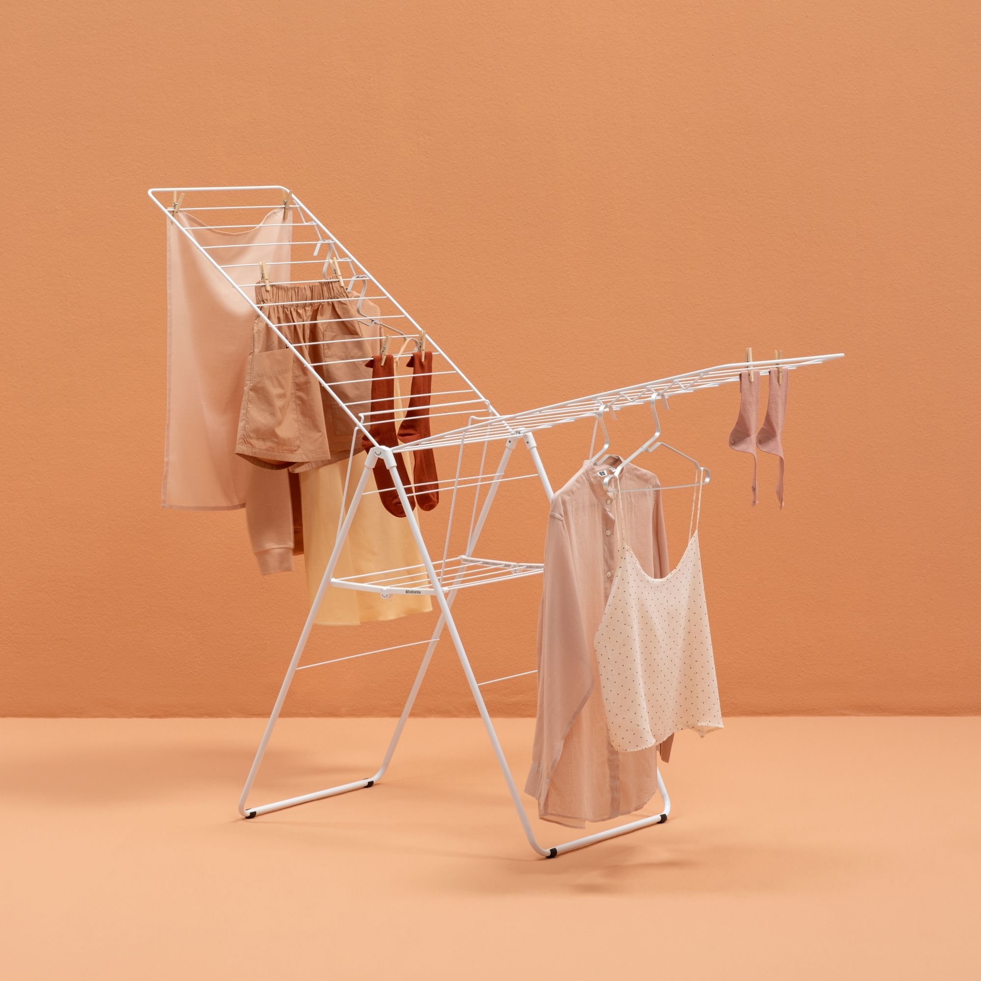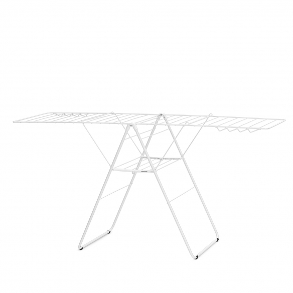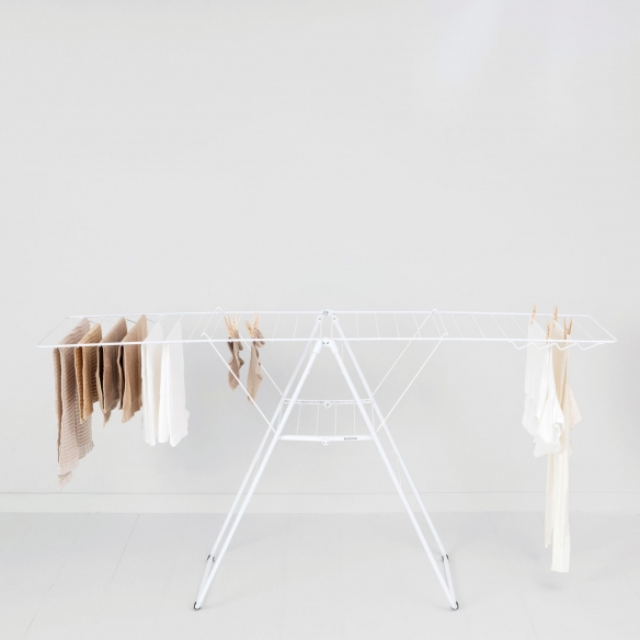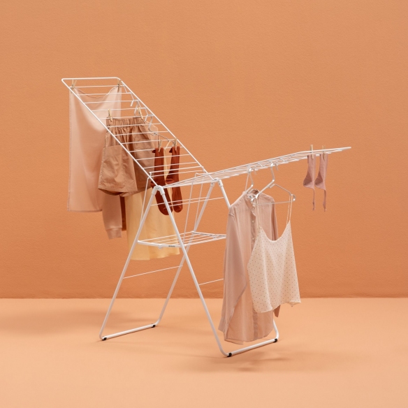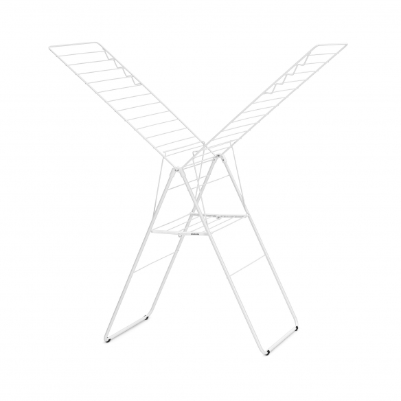 Clothesline from the HangOn collection, 25 meters long, made of resistant metal. Available in 3 color finishes, HangOn is an essential accessory in your home: it is light, practical, compact and uses space in an intelligent way! It can hold up to 3 loads of laundry and the height of the wings is adjustable! The dimensions remain contained, both when folded and when closed. The sturdy protective feet prevent damage to the floor and ensure great stability. The drying rack par excellence! Designed and made by Brabantia.