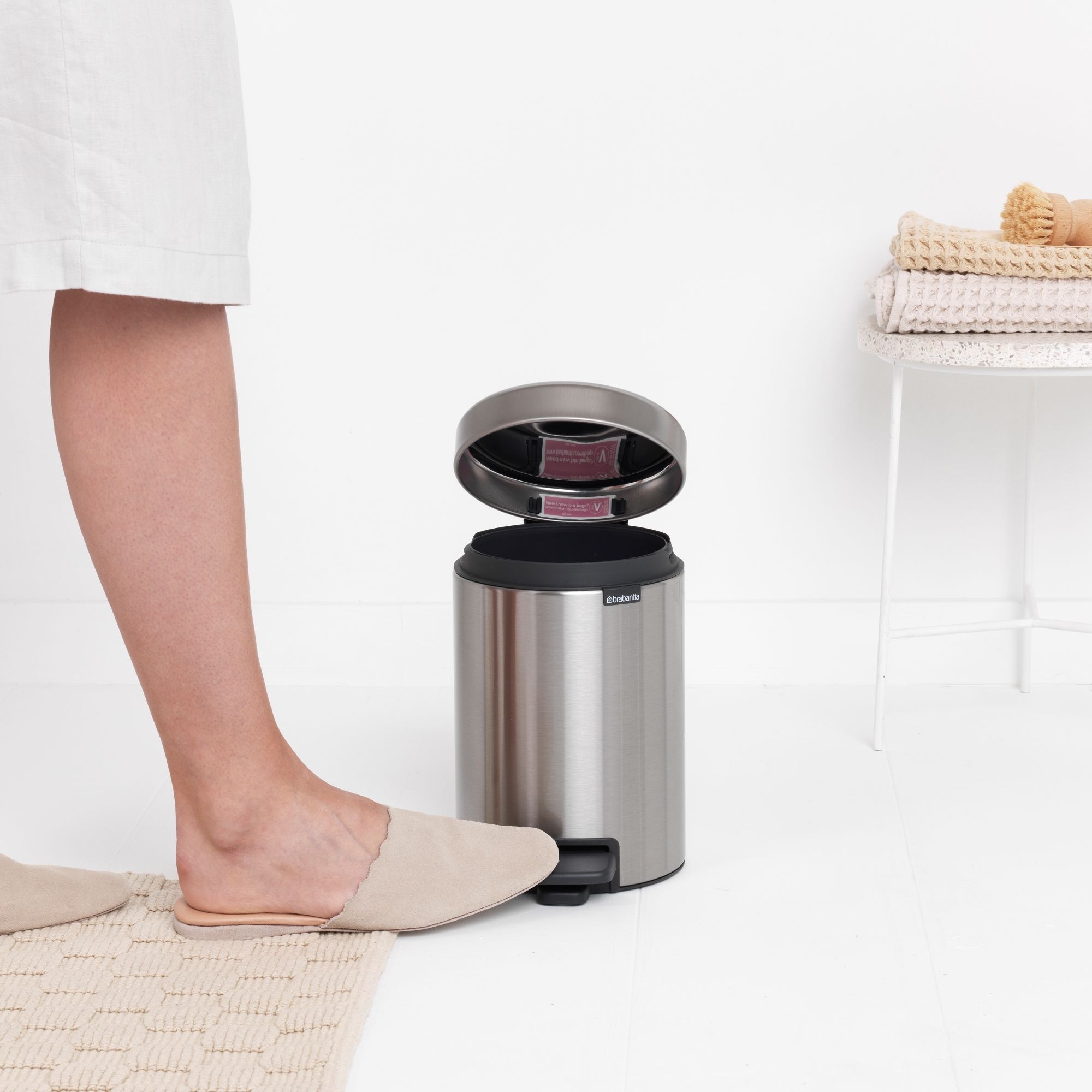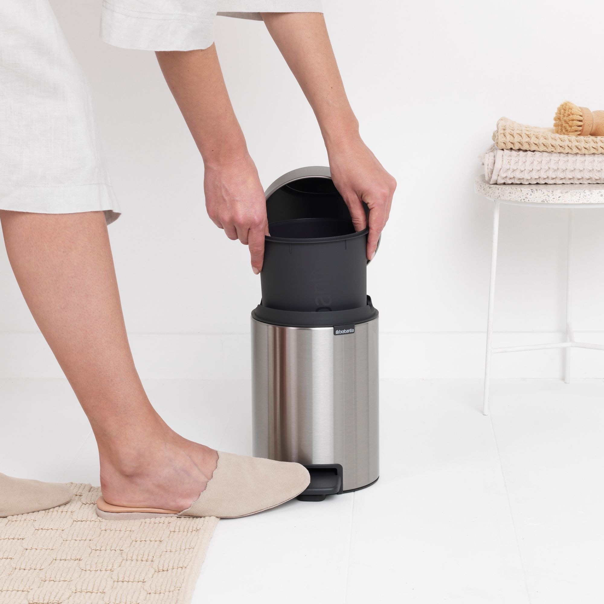 Pedal bin with 3 litres capacity, belonging to the NewIcon collection, made of metal with plastic inner bucket. Available in 13 color finishes, NweIcon is a real icon of cleanliness. Inserting and removing the bag is very simple, the internal bucket with ventilation holes avoids the vacuum effect. This waste bin with a timeless and hygienic design opens with a light touch of the pedal, is odorless and has a soft close. Other advantages: the non-slip base that always keeps it in place, and, of course, the iconic look. Impossible not to love her! Designed and projected by Brabantia.