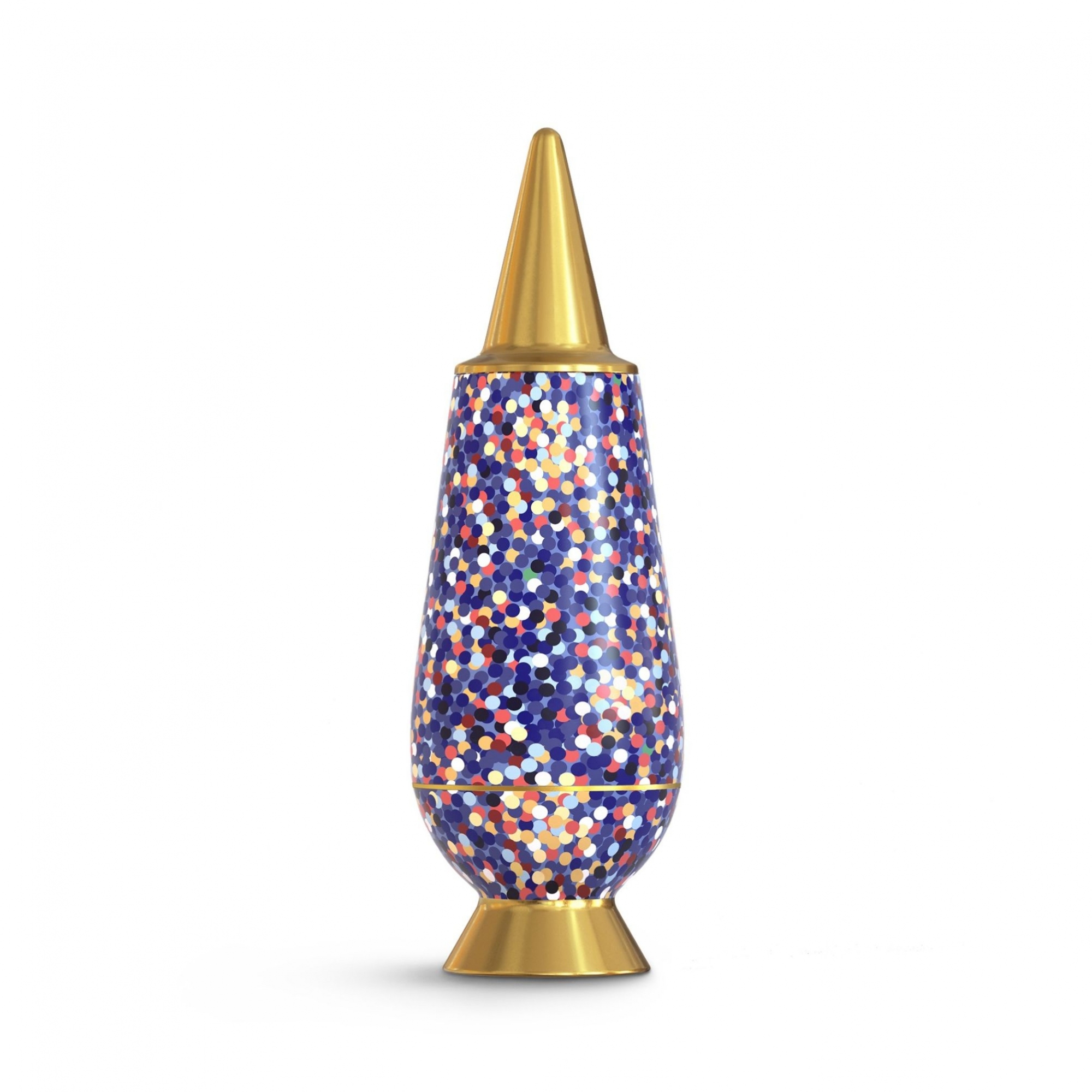 100% Proust make-upp vase, made with decorated porcelain structure and gold lid. Made in only 999 copies and 3 author's proofs, the 100% Proust make-up vase is a striking example of art and design, dedicated to all collectors of unique objects. The lid and base are decorated in pure gold applied by hand, accompanied by the body decoration, inspired by the famous writer Marcel Proust and the Parisian pointillists. A unique object ready to shine on your decor! Designed by Alessandro Mendini for Alessi.