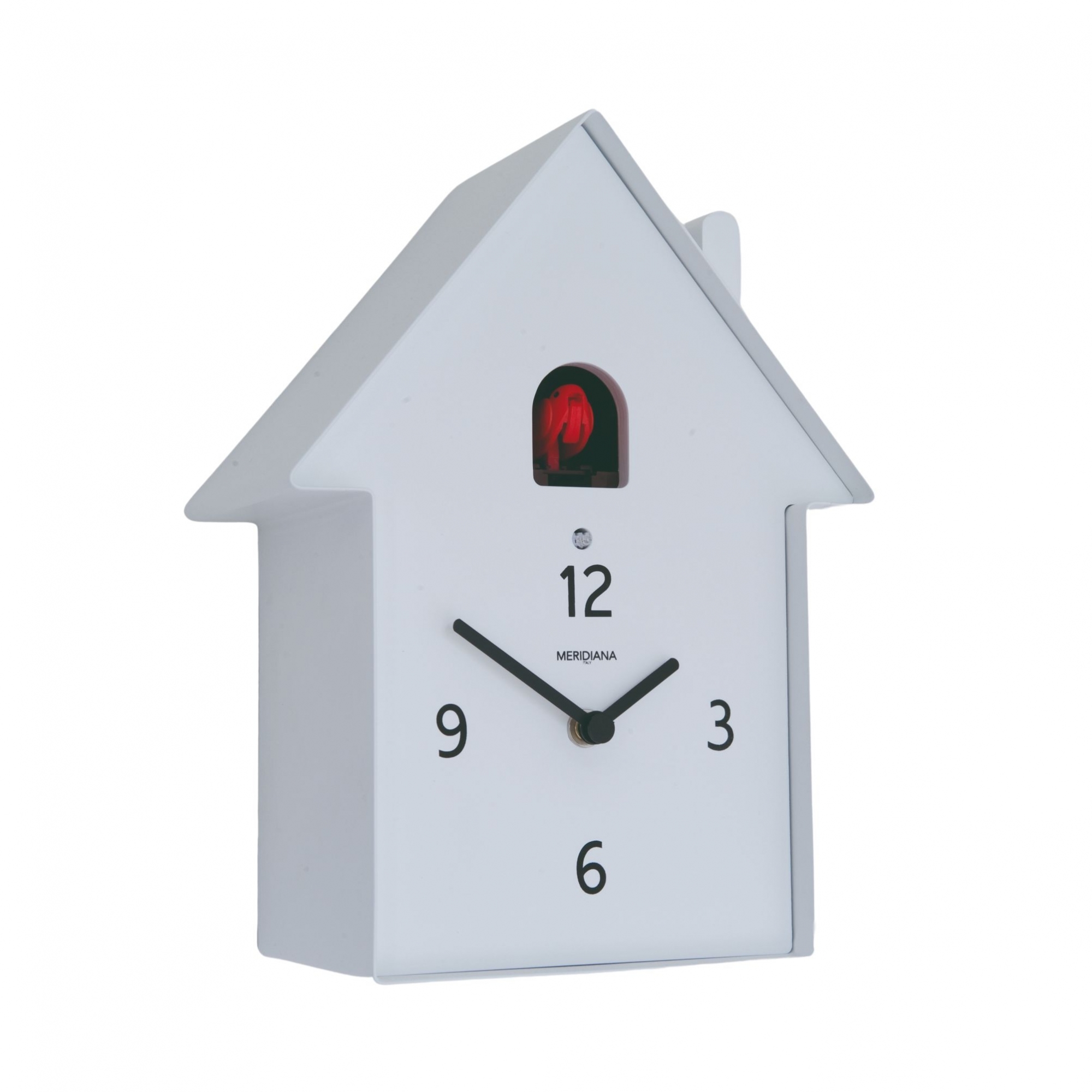 Meridiana cuckoo wall clock made of lacquered metal. Available in 6 beautiful colours, the Meridiana cuckoo wall clock features a bold and minimalist design, combining the traditional charm of the cuckoo house with a clean, modern aesthetic. The Meridiana cuckoo clock possesses a white front impeccably integrated with a black frame, adding a crisp contrast that catches the eye. The black hands and Arabic hour numerals, highlighted on the pristine white background, add a graphic touch that makes it easy to read the time even from a distance. Two silent hands mark the passage of time with a serenity that gives the watch a calm and meditative presence. Designed by Pascal Tarabay for Domeniconi.
