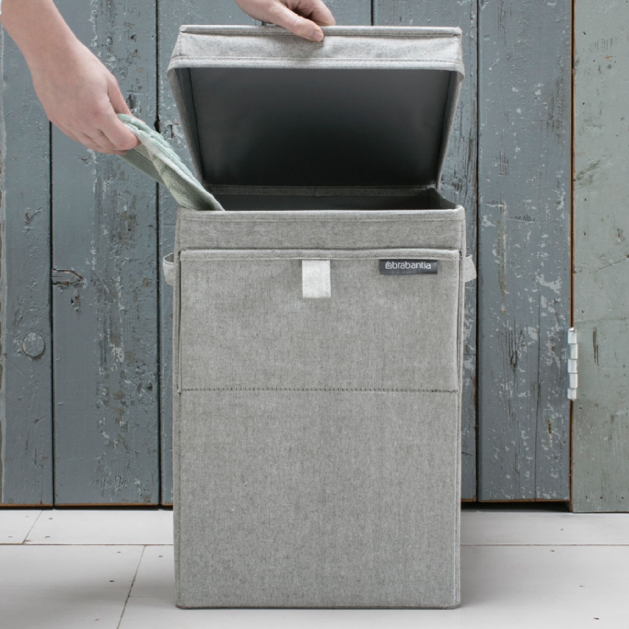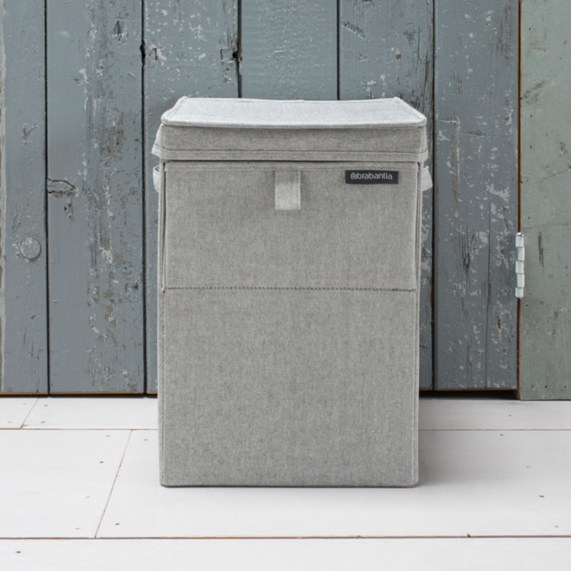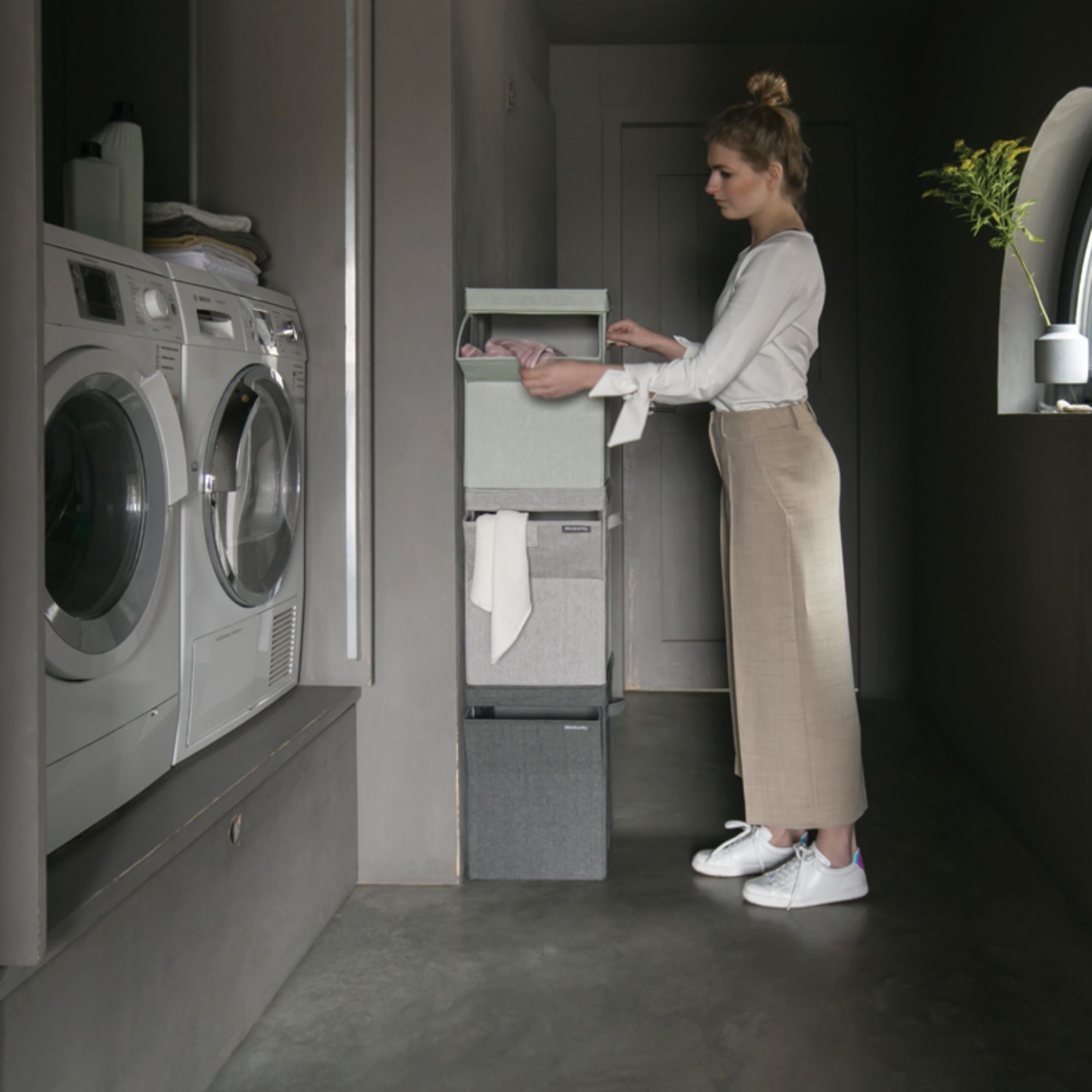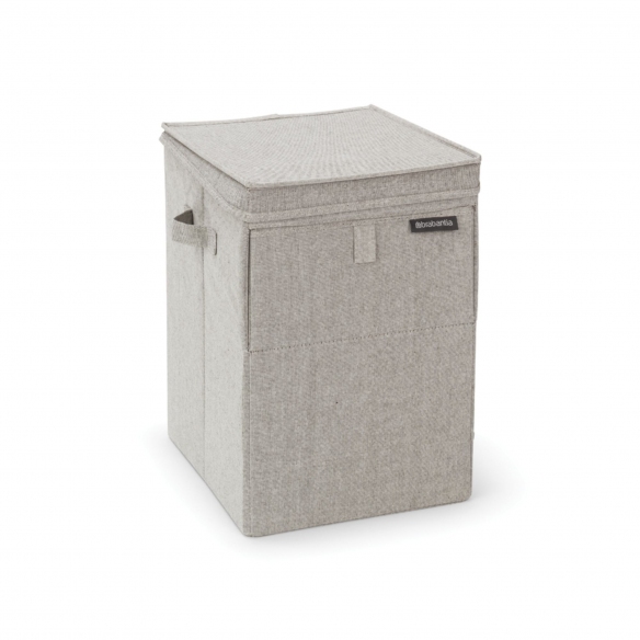 Stackable laundry basket made of fabric. It is the perfect space saver, as it is stackable, but it is also very large to carry a load of laundry, with a capacity of 35 liters. It is excellent for separating laundry and is easy to fill and empty, thanks to the opening in the front and at the top. The double opening also serves to insert the laundry if the laundry baskets are stacked together. Designed and produced by Brabantia.