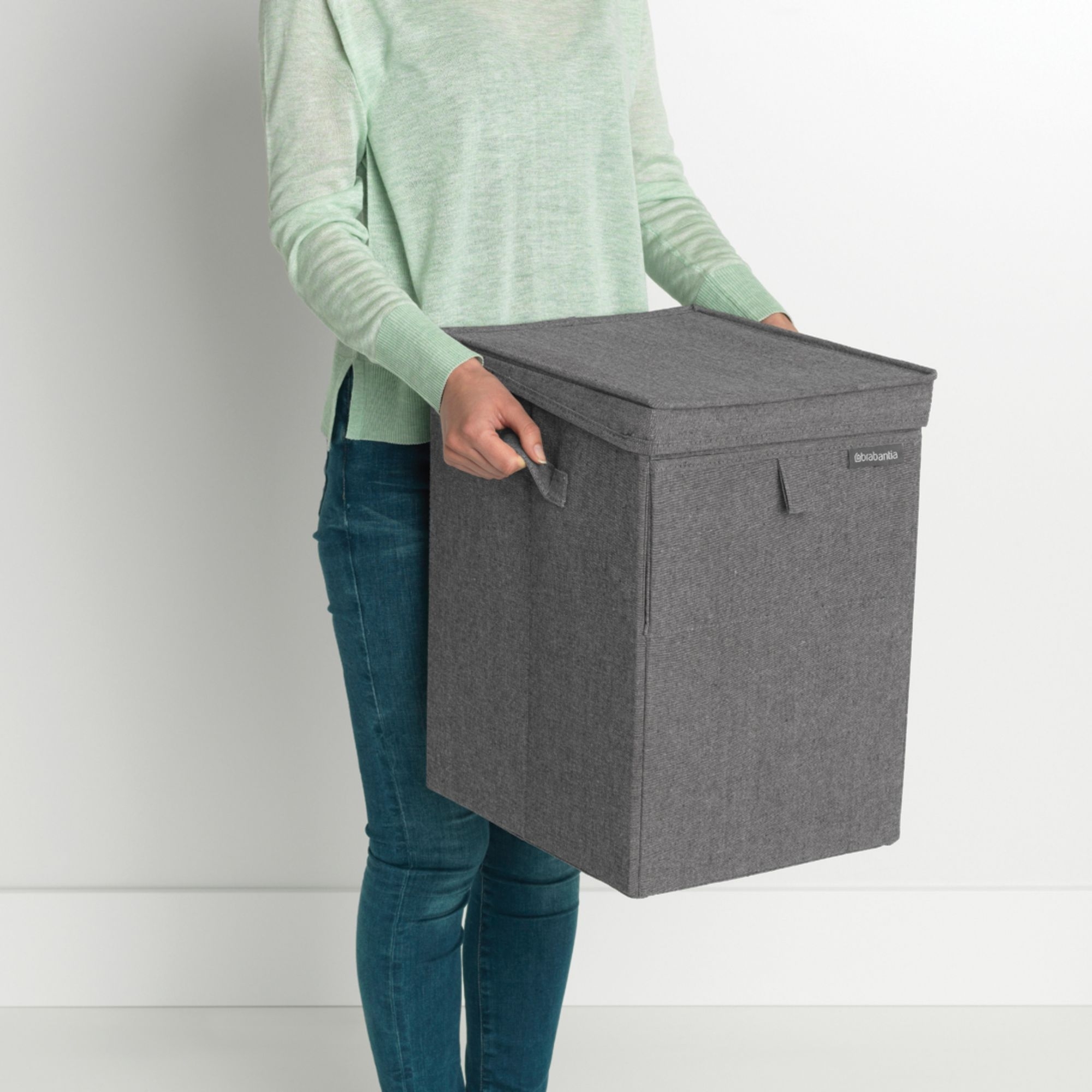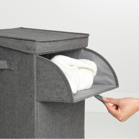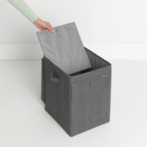 Stackable laundry basket made of fabric. It is the perfect space saver, as it is stackable, but it is also very large to carry a load of laundry, with a capacity of 35 liters. It is excellent for separating laundry and is easy to fill and empty, thanks to the opening in the front and at the top. The double opening also serves to insert the laundry if the laundry baskets are stacked together. Designed and produced by Brabantia.