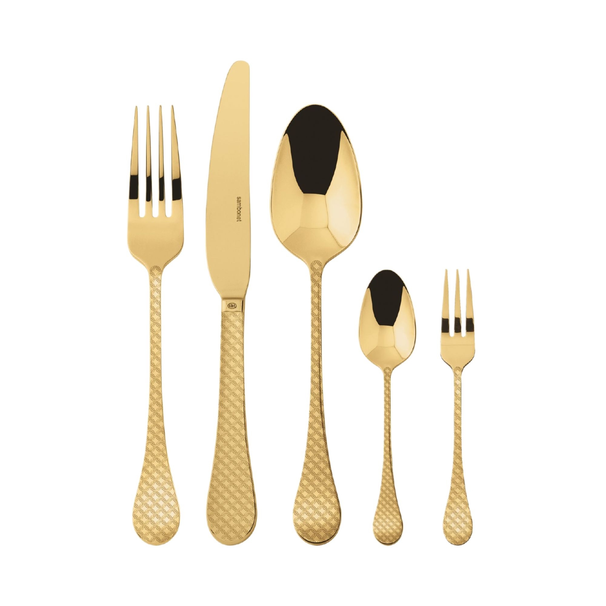 30 cutlery set from the new Taormina collection, made of 18/10 stainless steel, PVD coating. Available in 4 special finishes, the 30 Taormina cutlery set includes: