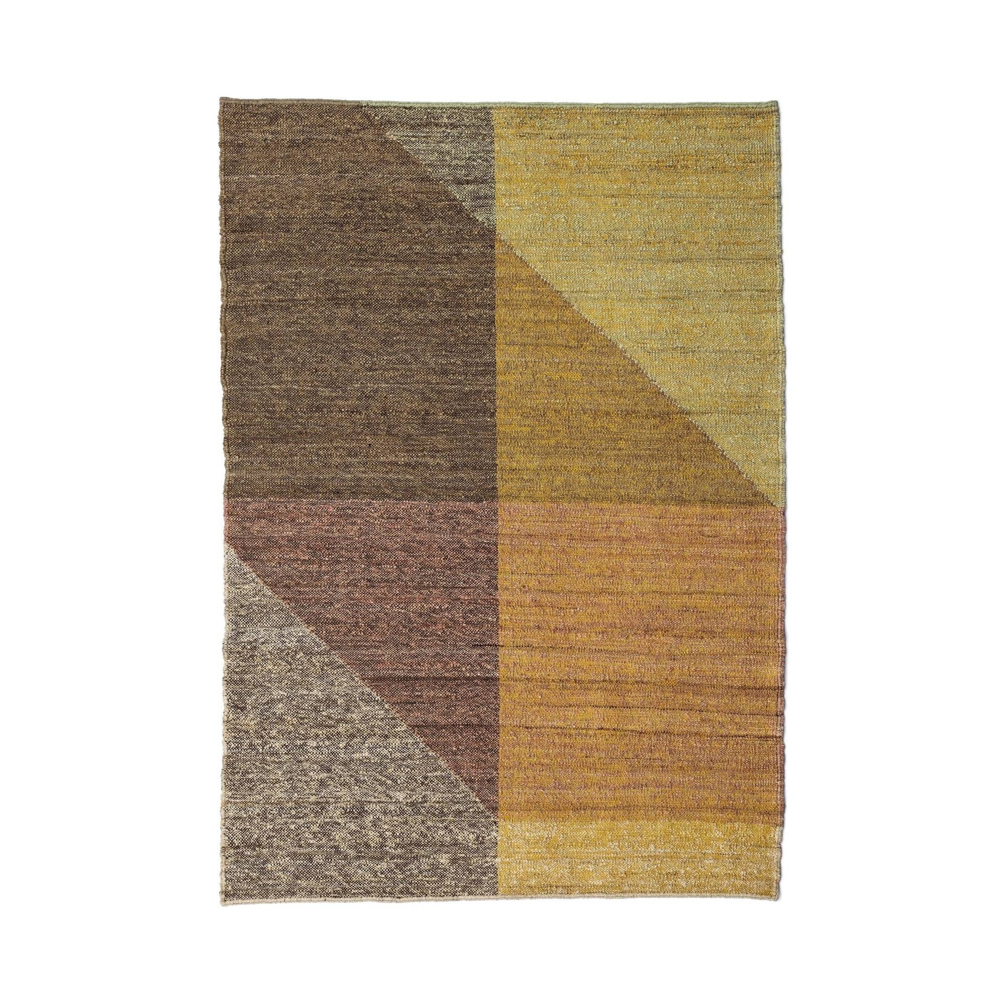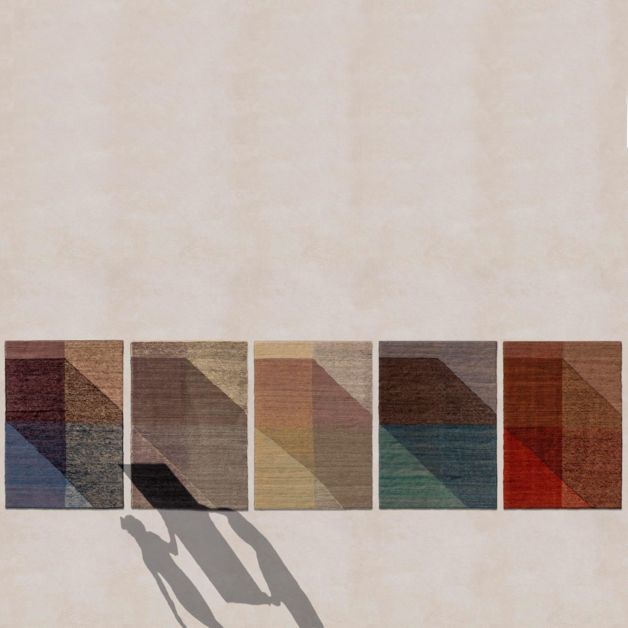 Capas rug made of 100% Afghan wool fibre spun by hand according to the Klim technique. Capas is the carpet that has been created and designed by the designer in a personal and unique way. Capas is available in different colours and sizes, featuring a main tone, a complementary tone and a darker shade that gives the illusion of a shadow cast on the floor. This play of colours allows Capas carpets to blend into any environment, from the bedroom to the living room. The unique texture creates a chiaroscuro effect and great depth without weighing it down. Designed by Mathias Hahn.
