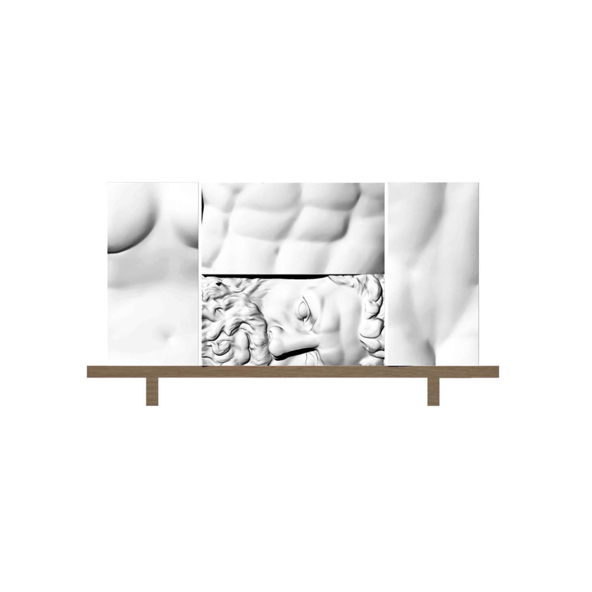 Container belonging to Ercole and Afrodite collection made of matt lacquered blockboard, fronts in high density polyurethane. Additional base in poplar particles agglomerate with tubular steel reinforcement inserted inside. With a strong scenic impact, the Ercole and Afrodite container features a design built from anthropomorphic lines and raw colors, with a surprising combination of decorative art and historical language. Designed by DriadeLab.