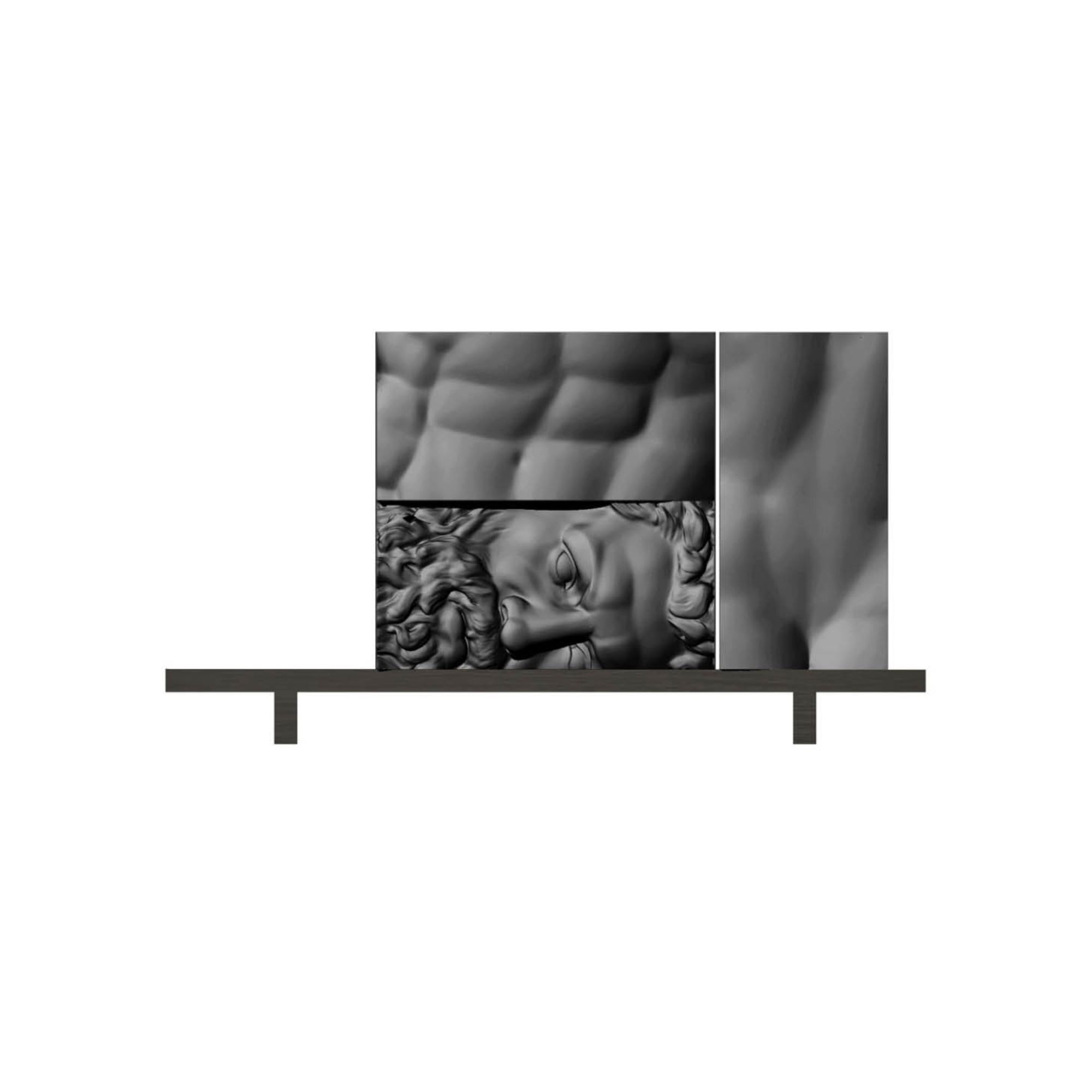 Container belonging to Ercole and Afrodite collection made of matt lacquered blockboard, fronts in high density polyurethane. Additional base in poplar particles agglomerate with tubular steel reinforcement inserted inside. With a strong scenic impact, the Ercole and Afrodite container features a design built from anthropomorphic lines and raw colors, with a surprising combination of decorative art and historical language. Designed by DriadeLab.