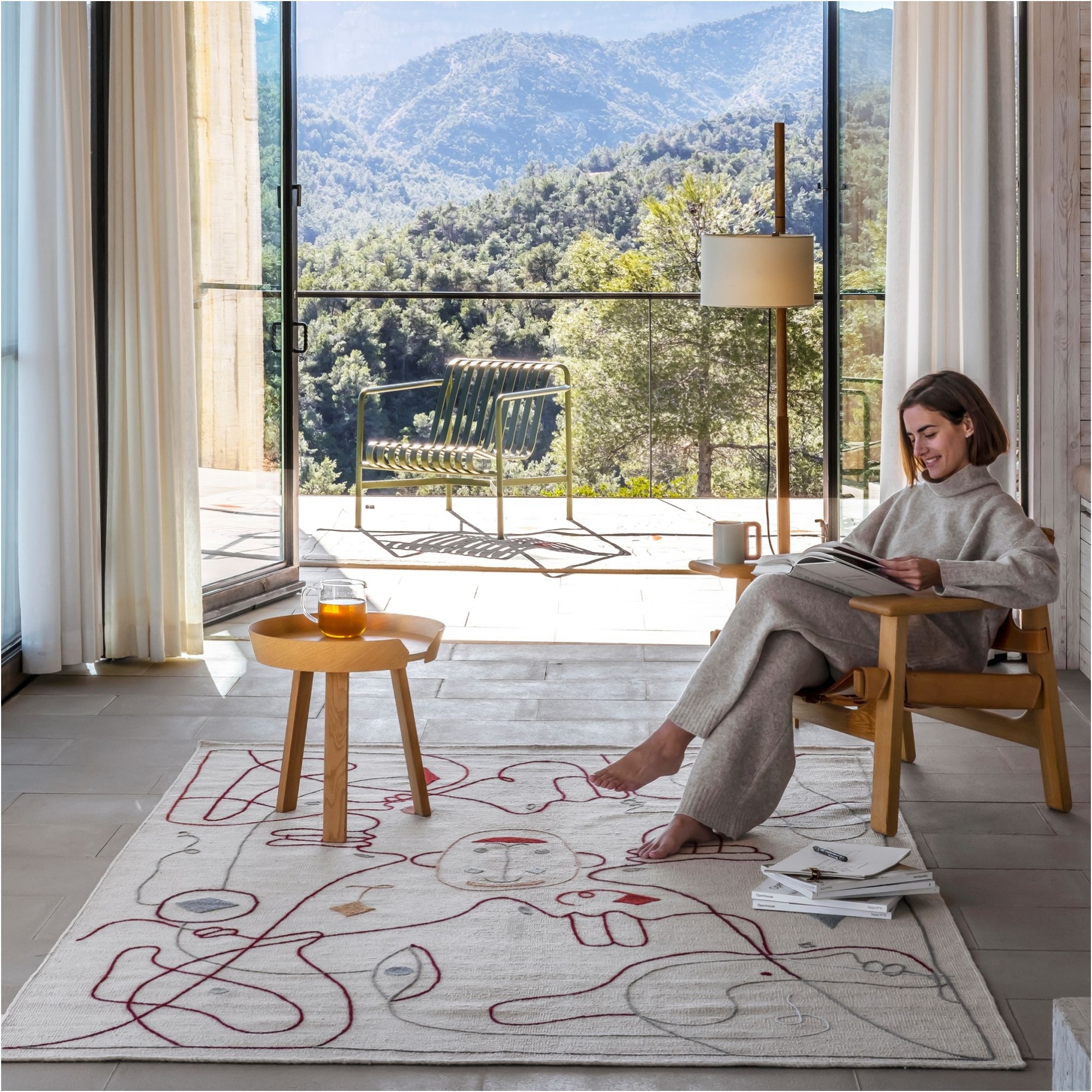 Needless to say, Jaime Hayon's touch is unmistakable! From the first look at this rug, we recognize his relaxed, cheerful, dreamy and exuberant style. Thin, sinuous lines intertwine to form nine tangled faces. This playful and abundant composition draws our imagination. The portraits are punctuated with light touches of color. Each face is drawn from a different angle so that the rug can be admired from any side. Between abstraction and figurative: at first glance, the flowing, intuitive lines intertwine to form an abstract pattern. With a closer look, the chimerical characters take shape. Jaime Hayon wanted to give this rug the look of sketches scribbled in a notebook.