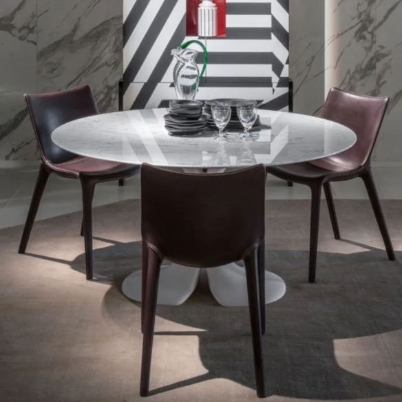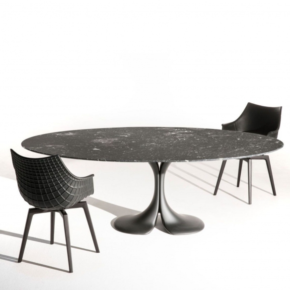 A table with a diameter of 110 cm, belonging to the Didymos collection, made of marquina marble and black or white coated Cristalplant. Elegant and functional design make Didymos a simply perfect table: no edges, no headboard and above all a fantastic shape in space. Ideal for furnishings with a contemporary touch, Didymos will be a pleasant presence in every corner of the house. Designed by Antonia Astori for Driade.