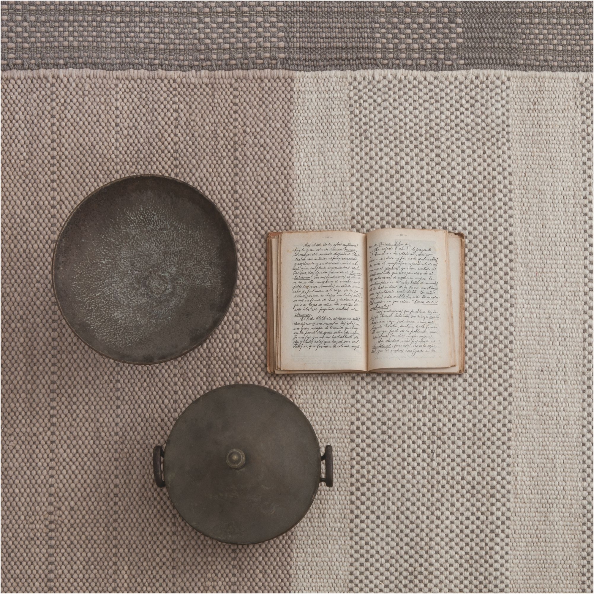 Tres rug made of New Zealand wool and felt. The Tres rug consists of three color strips that are sewn together. In addition, the color variations are various, from black to blue, from sage to ocher, from turquoise to pearl. The technique used is Dhurrie and Indian and Japanese traditions come into contact to create this wonderful rug. Designed by Nani Marquina.