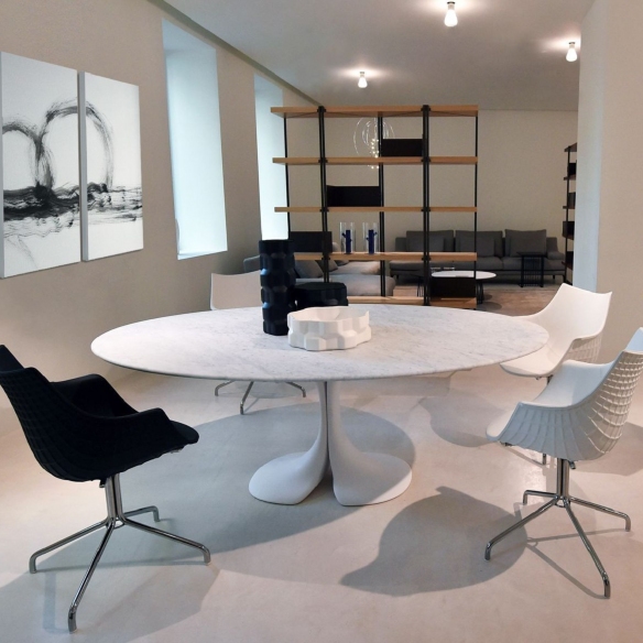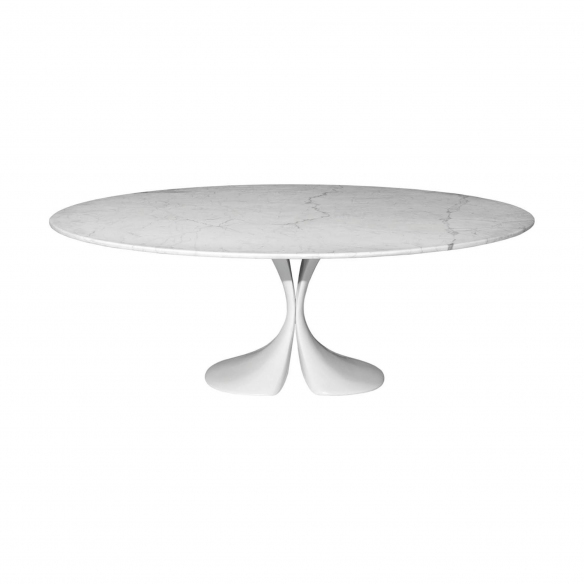 A table 250x128 cm, belonging to the Didymos collection, made of marquina/carrara marble and black or white coated Cristalplant. Elegant and functional design make Didymos a simply perfect table: no edges, no headboard and above all a fantastic shape in space. Ideal for furnishings with a contemporary touch, Didymos will be a pleasant presence in every corner of the house. Designed by Antonia Astori for Driade.