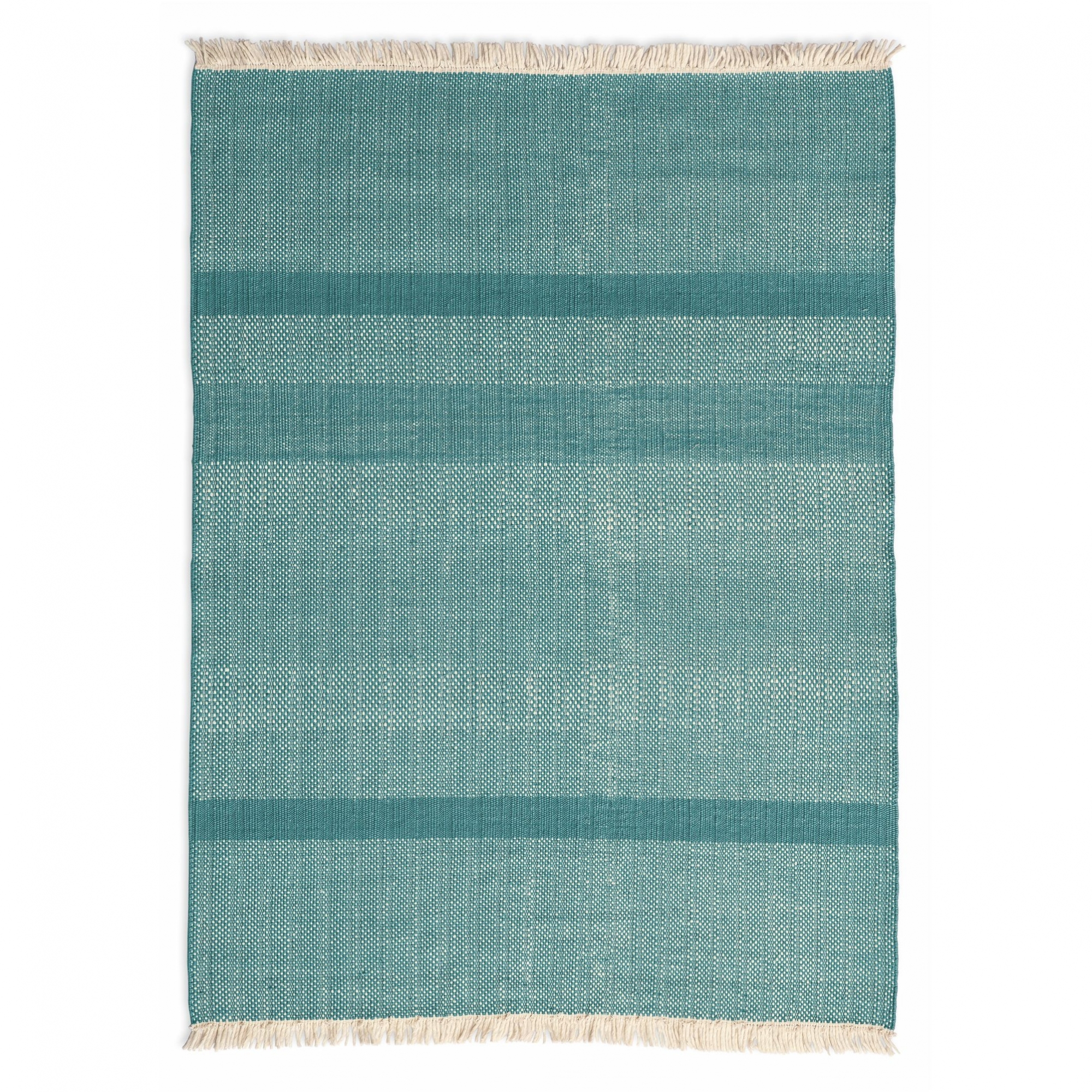 Tres Texture rug made from New Zealand wool and felt. The Tres rug is made up of strips of color that are sewn together. The technique used is Dhurrie and Indian and Japanese traditions come into contact to create this wonderful carpet. Available in various sizes and 7 color variations: black, blue, sage, ochre, turquoise, chocolate and pearl, Tres is the timeless rug. Designed by Nani Marquina.