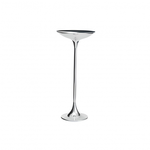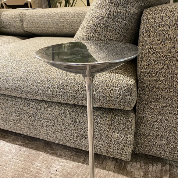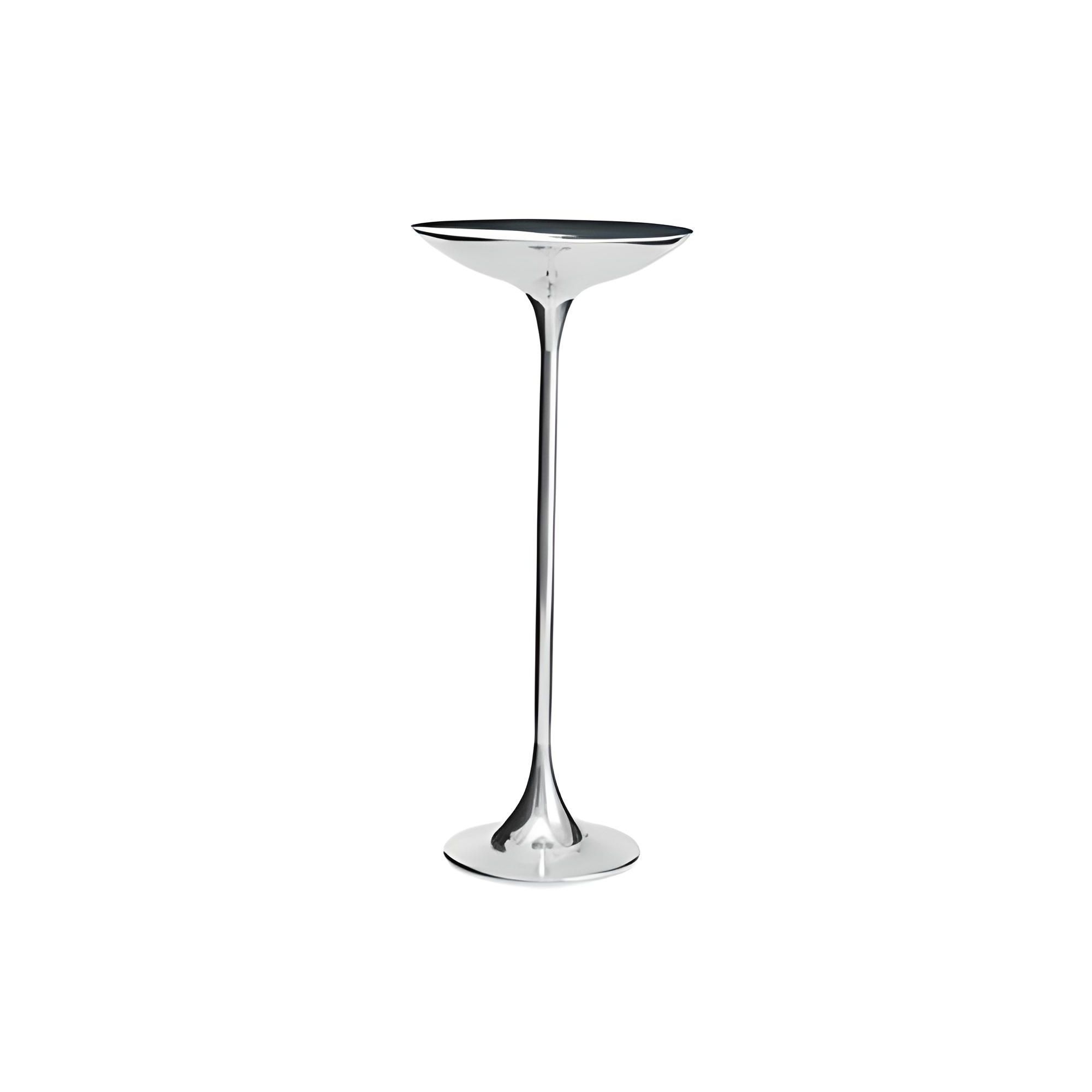Ping II coffee table, made of polished aluminum. With a height of 50 cm, the Ping II table has a linear and compact design, behaving both as a discreet piece of furniture and as a practical pocket emptier. It fits easily into any corner of the house and can also be used as a table top for a glass or a book. Designed by Giuseppe Chigiotti for Driade.