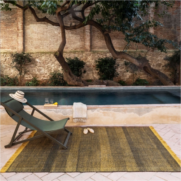 Tres Texture Outdoor rug made of PET. Tres rug is made up of strips of color that are sewn together. This rug is designed specifically for outdoor use in a weather and UV resistant material. Washable with water and mild detergent, it can also be used indoors. Designed by Nani Marquina.