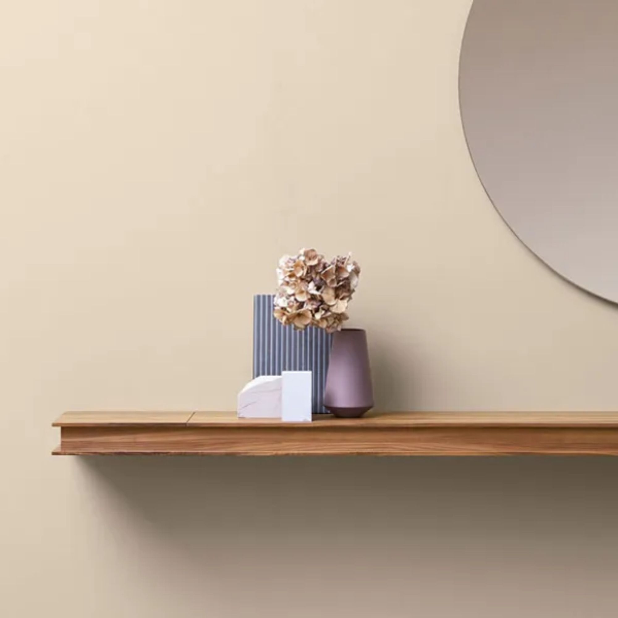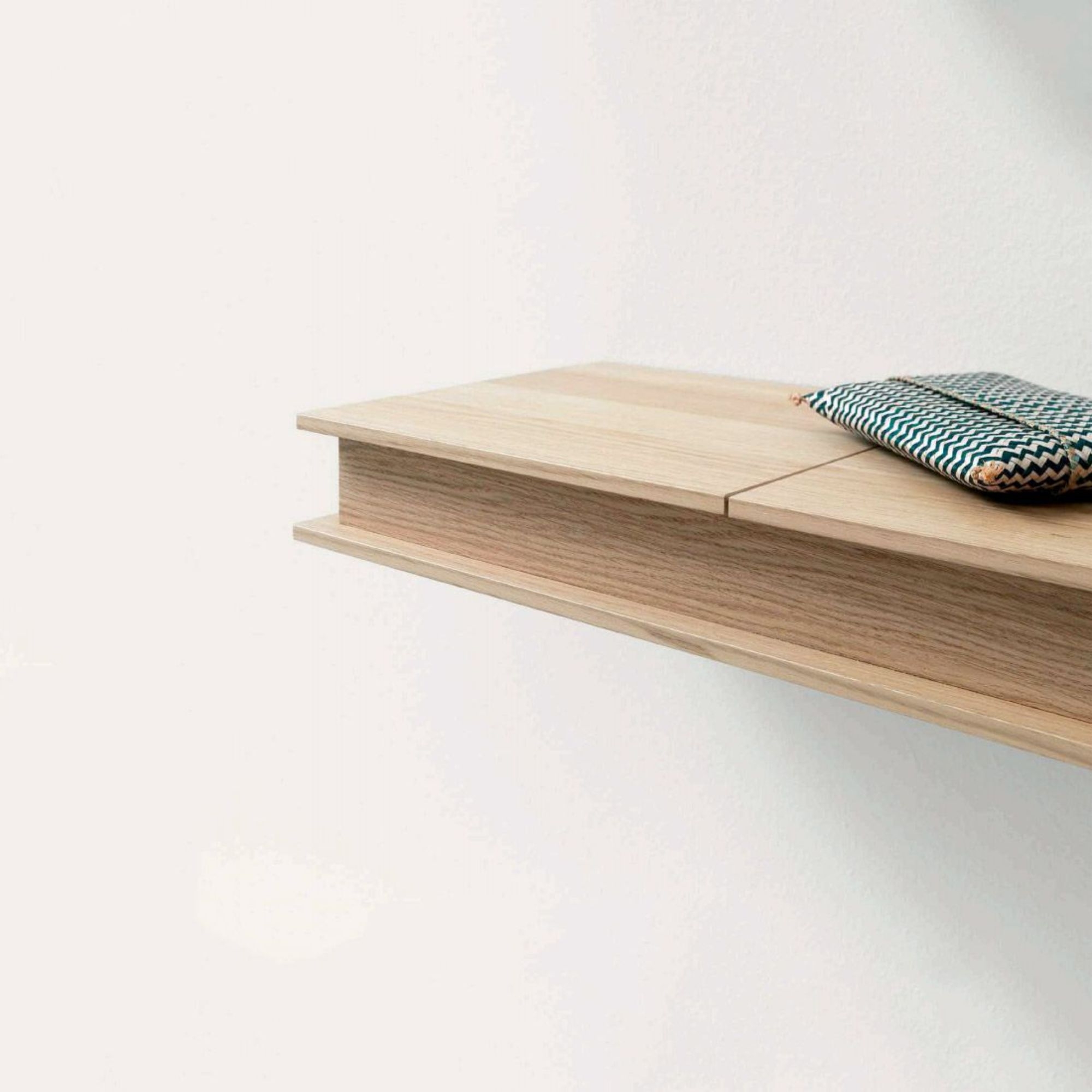 Flap shelf made of wood. Flap is available in a variety of wood types, chopped, oak and walnut and comes in three different sizes. The Flap shelf has a hidden drawer that can be opened through a splashback. The maximum load capacity of this shelf is 35 kg. Designed by Avio Calandrin for Sculpture Jeux.