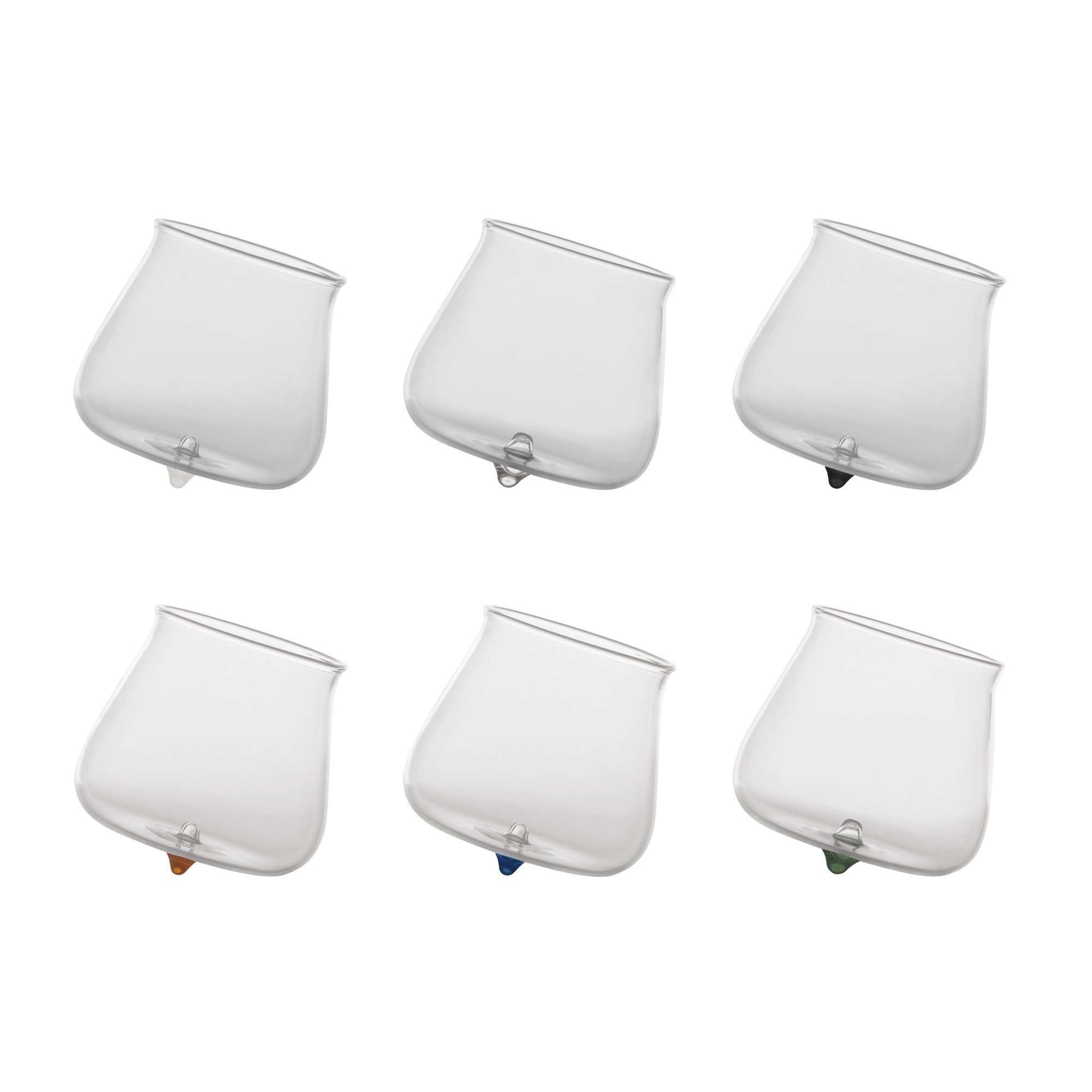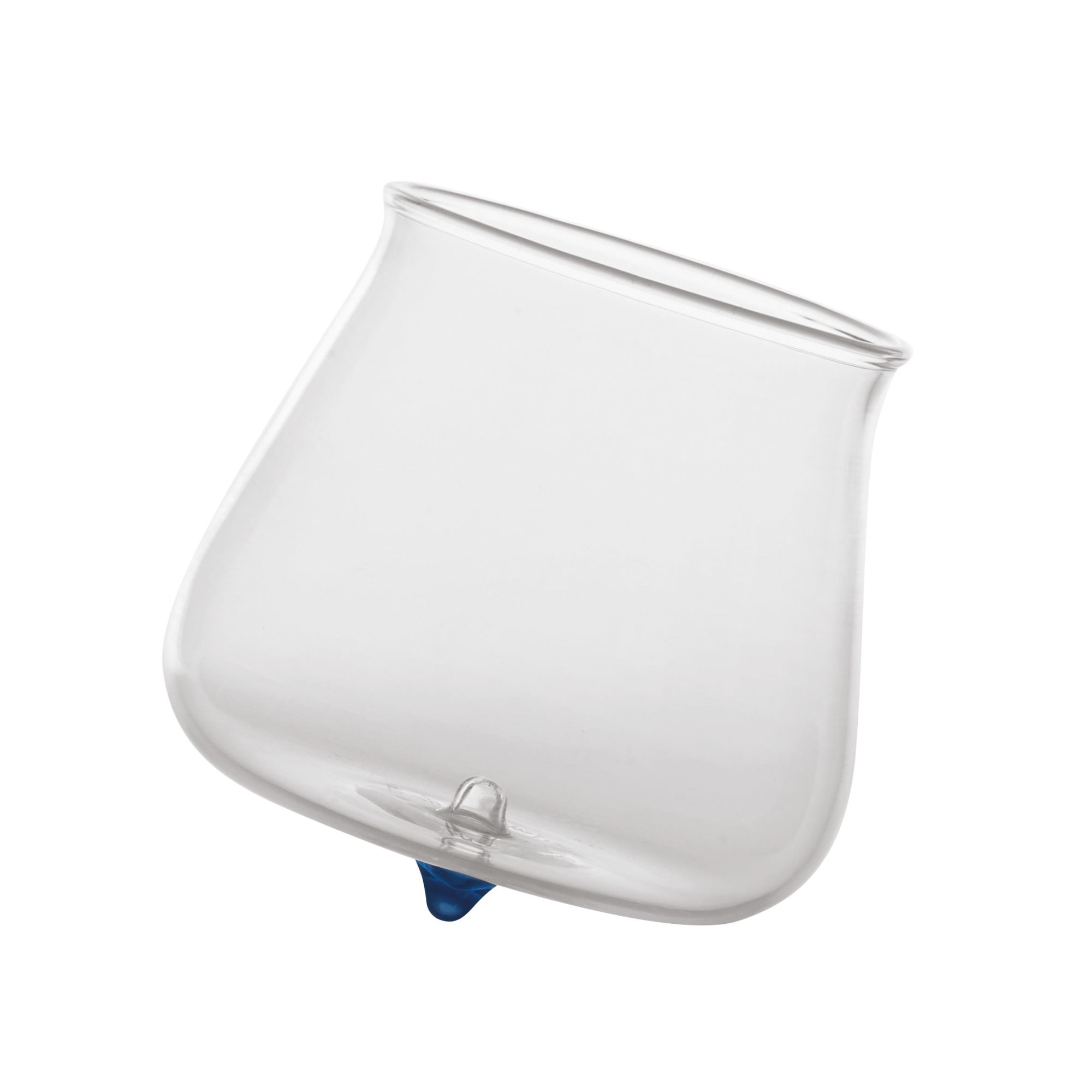 6 glasses of 40 cl, belonging to the Pirolo collection, made of handmade borosilicate glass. The glasses are available in 6 different colors: white, transparent, black, amber, blue and green. The shape is inspired by one of the classic childhood games, the spinning top: the element that protrudes from the base makes the glass rotate around its axis. Elegant and refined, Pirolo glasses will make important occasions magical. Designed by Federico De Majo for Zafferano.