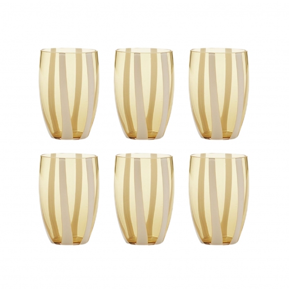 6 glasses of Gessato collection made of colored glass, blown and handmade. Available in 6 different colors, Gessato glasses have a classic and elegant design. The bands of white paste interrupt the uniformity and brightness of the color, making the glasses very similar to each other. They have a capacity of 32 cl and are perfect for any occasion! Designed by Federico De Majo for Zafferano.
