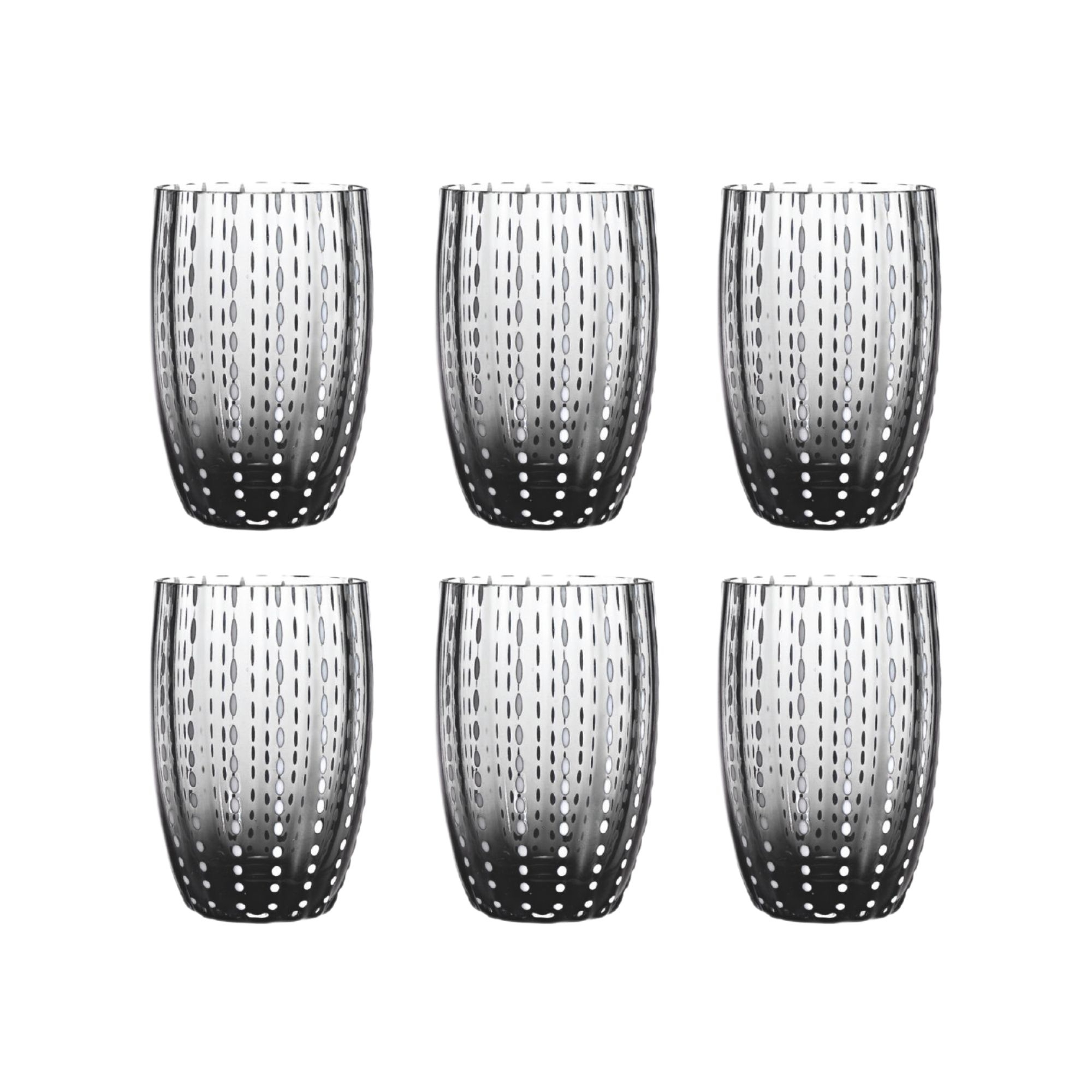 6 glasses with 32 cl capacity, belonging to Perle collection, made of handmade borosilicate glass. Available in 14 different colors, Perle glasses stand out for their exclusive design and high quality materials. Pearls are present on the entire surface of the glass, giving additional elegance and sophistication. The perfect glasses to add a touch of liveliness to the table! Designed by Federico De Majo for Zafferano.