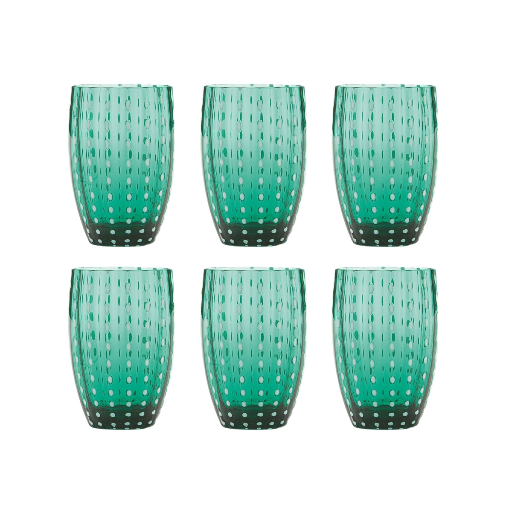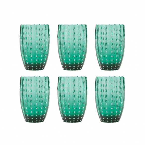 6 glasses with 32 cl capacity, belonging to Perle collection, made of handmade borosilicate glass. Available in 14 different colors, Perle glasses stand out for their exclusive design and high quality materials. Pearls are present on the entire surface of the glass, giving additional elegance and sophistication. The perfect glasses to add a touch of liveliness to the table! Designed by Federico De Majo for Zafferano.