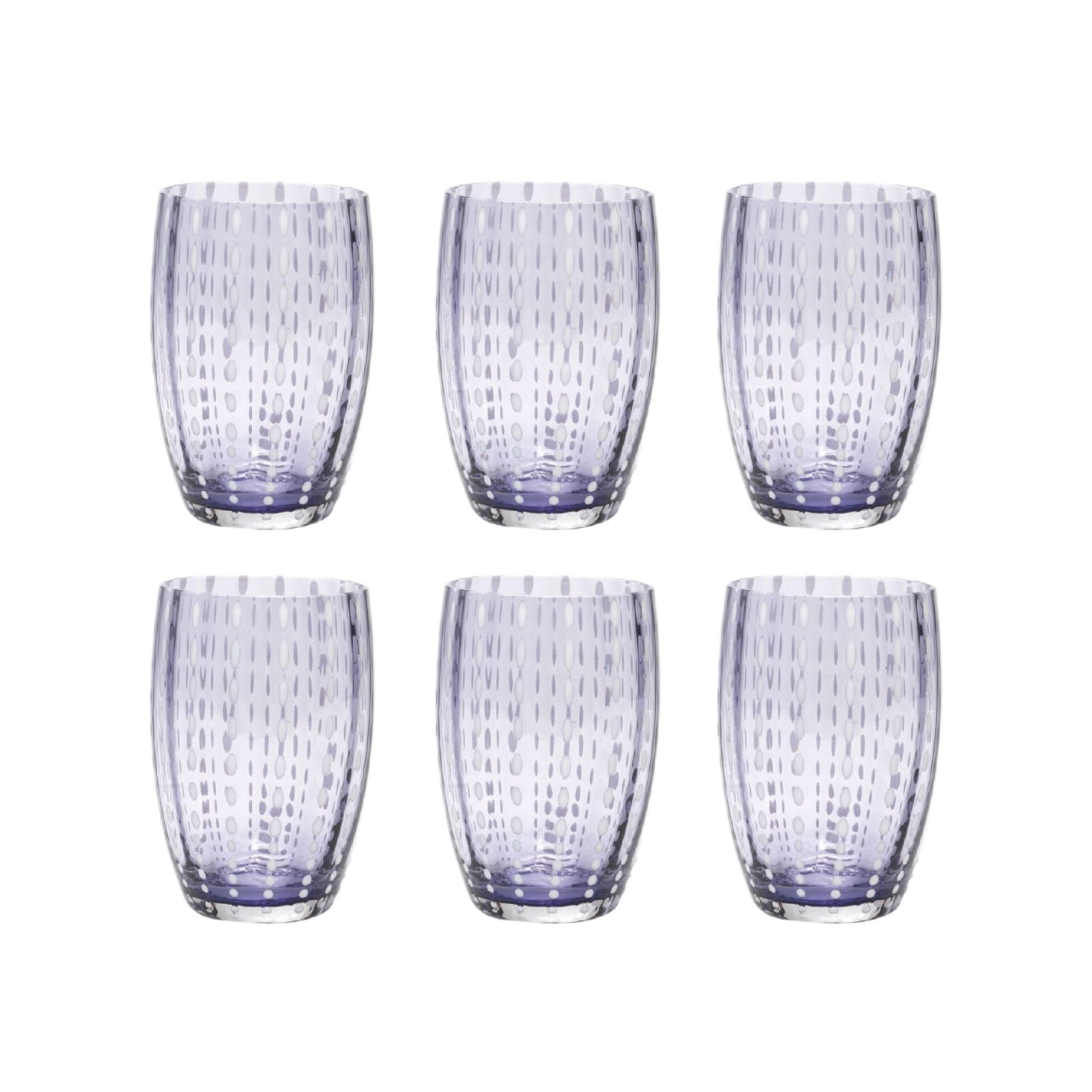 6 glasses with 32 cl capacity, belonging to Perle collection, made of handmade borosilicate glass. Available in 14 different colors, Perle glasses stand out for their exclusive design and high quality materials. Pearls are present on the entire surface of the glass, giving additional elegance and sophistication. The perfect glasses to add a touch of liveliness to the table! Designed by Federico De Majo for Zafferano.