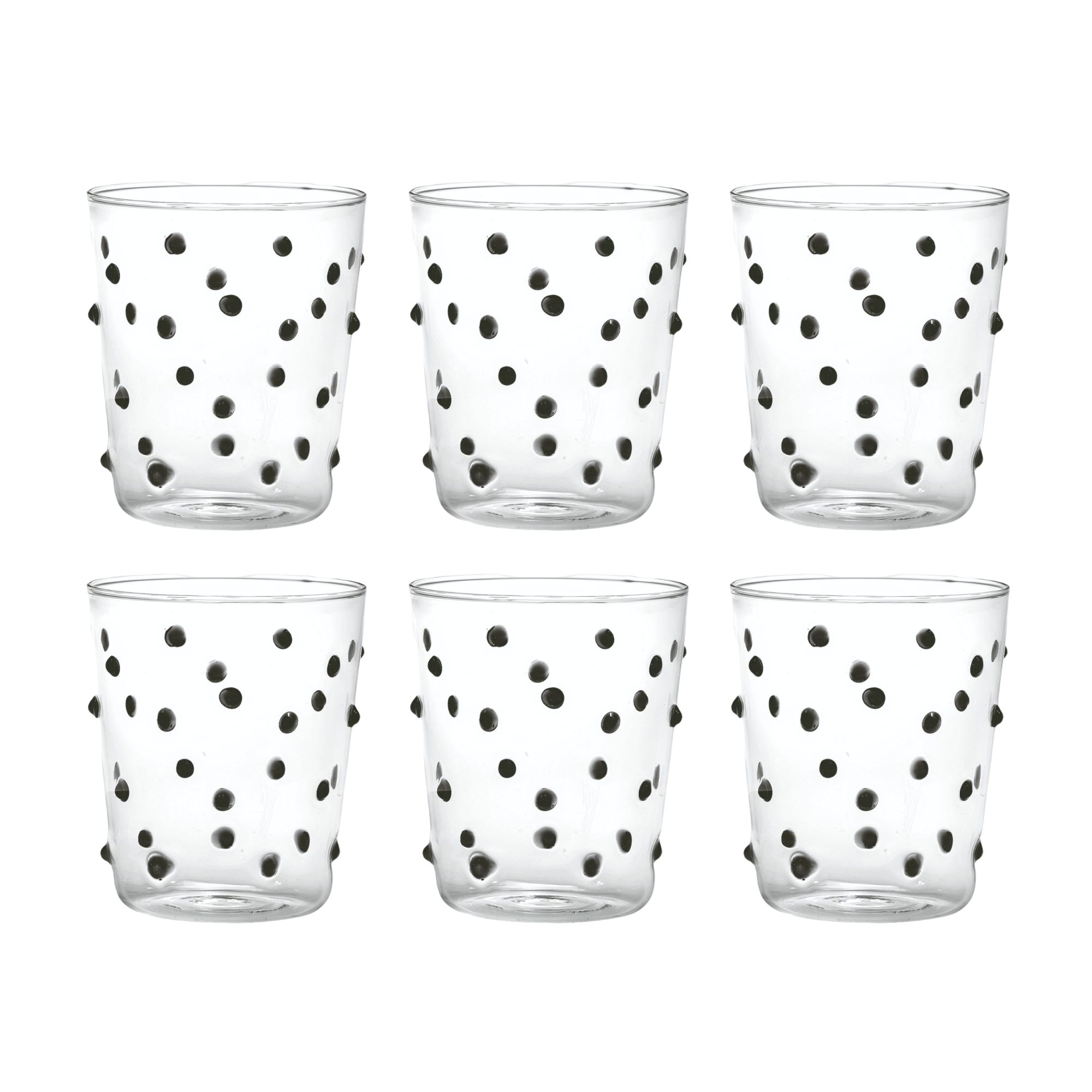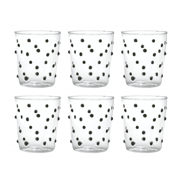 6 Party glasses of 45 cl made of handmade borosilicate glass. Available in 7 different and elegant color finishes, Party glasses stand out for the extraordinary preciousness of their design: numerous and brilliant sapphires alternate on the surface of each glass, giving a refined style to the whole set. Designed by Federico De Majo for Zafferano.