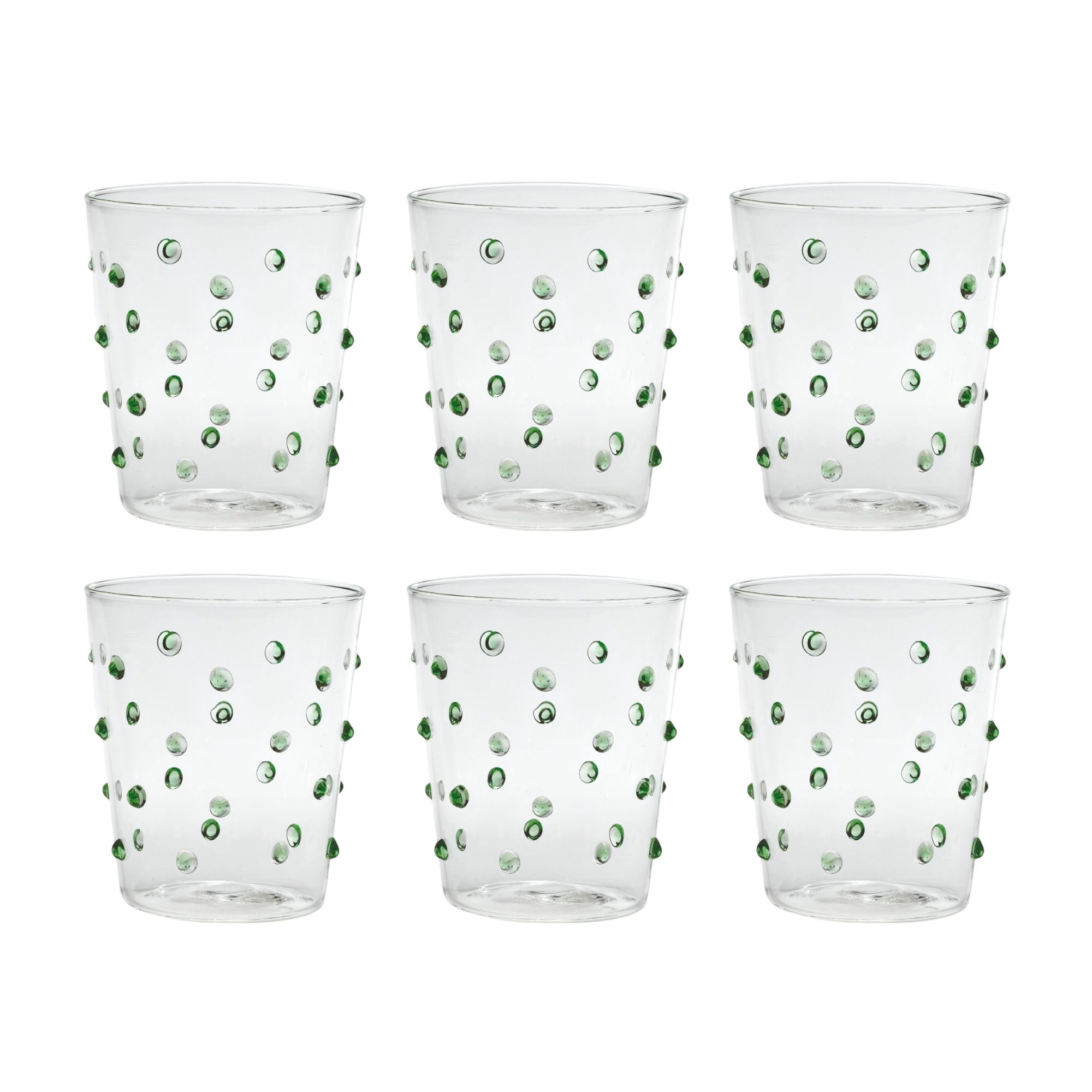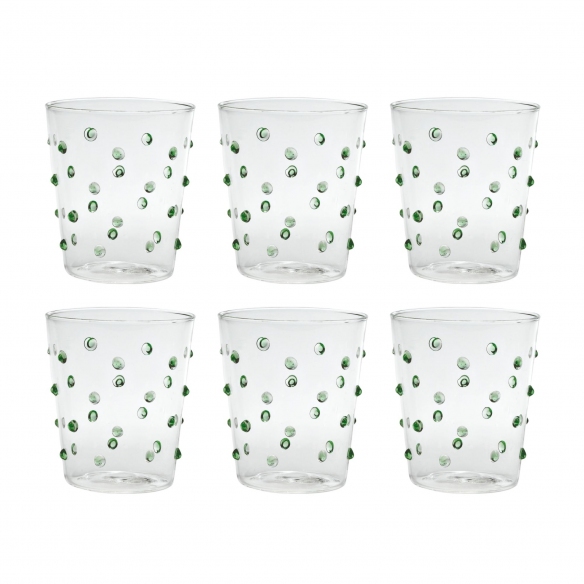 6 Party glasses of 45 cl made of handmade borosilicate glass. Available in 7 different and elegant color finishes, Party glasses stand out for the extraordinary preciousness of their design: numerous and brilliant sapphires alternate on the surface of each glass, giving a refined style to the whole set. Designed by Federico De Majo for Zafferano.