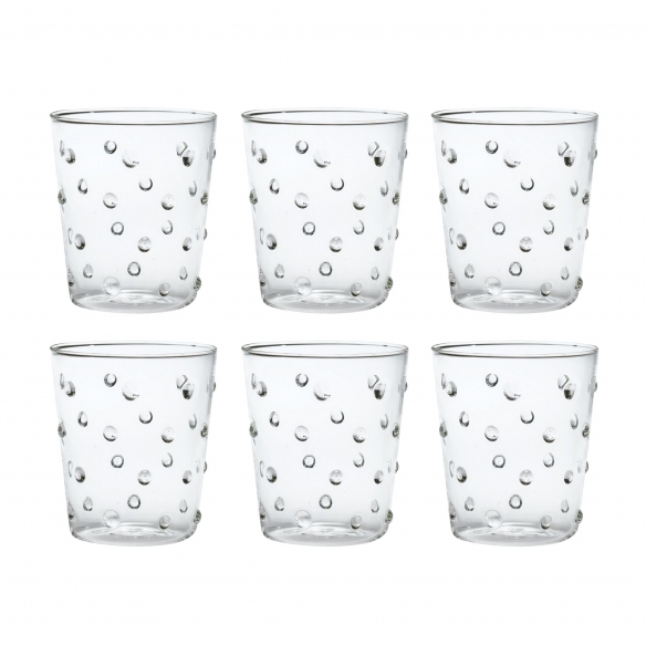 6 Party glasses of 45 cl made of handmade borosilicate glass. Available in 7 different and elegant color finishes, Party glasses stand out for the extraordinary preciousness of their design: numerous and brilliant sapphires alternate on the surface of each glass, giving a refined style to the whole set. Designed by Federico De Majo for Zafferano.