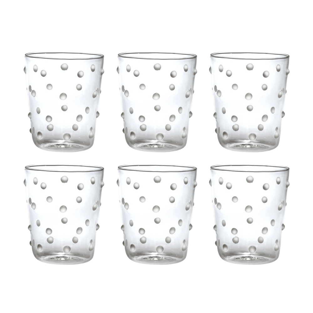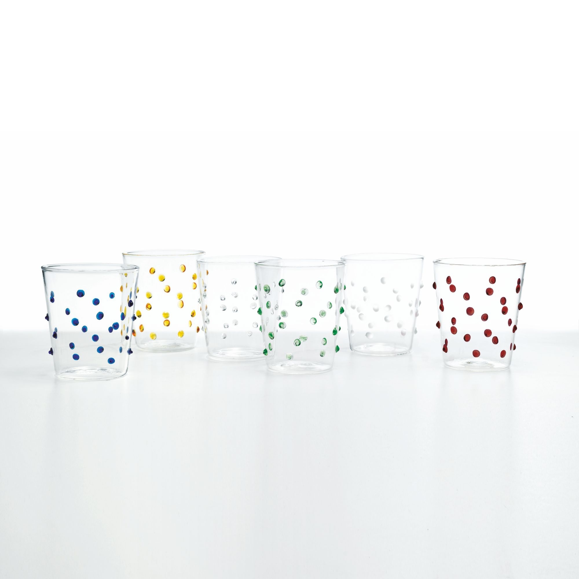 6 Party glasses of 45 cl made of handmade borosilicate glass. Available in 7 different and elegant color finishes, Party glasses stand out for the extraordinary preciousness of their design: numerous and brilliant sapphires alternate on the surface of each glass, giving a refined style to the whole set. Designed by Federico De Majo for Zafferano.