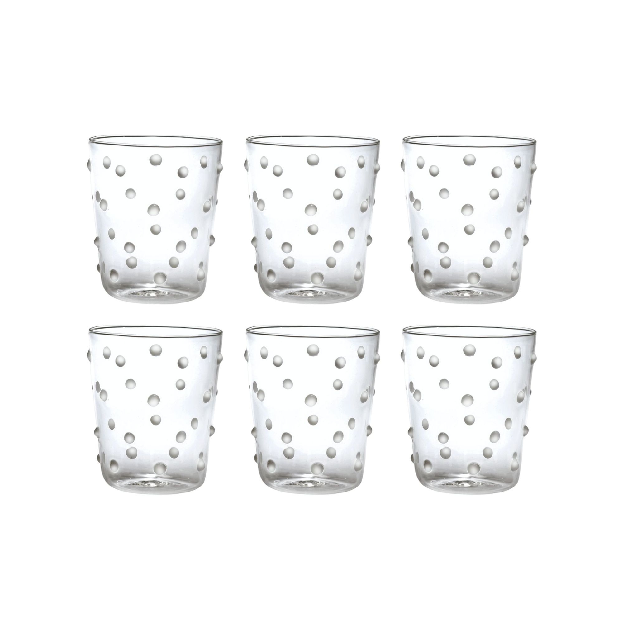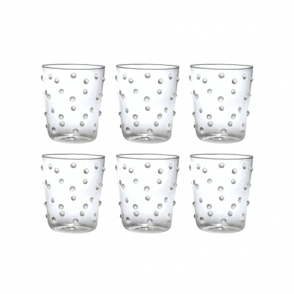 6 Party Junior glasses of 9.5 cl made of handmade borosilicate glass. Available in 7 different and elegant color finishes, Party Junior glasses stand out for the extraordinary preciousness of their design: numerous and brilliant sapphires alternate on the surface of each glass, giving a refined style to the whole set. Designed by Federico De Majo for Zafferano.