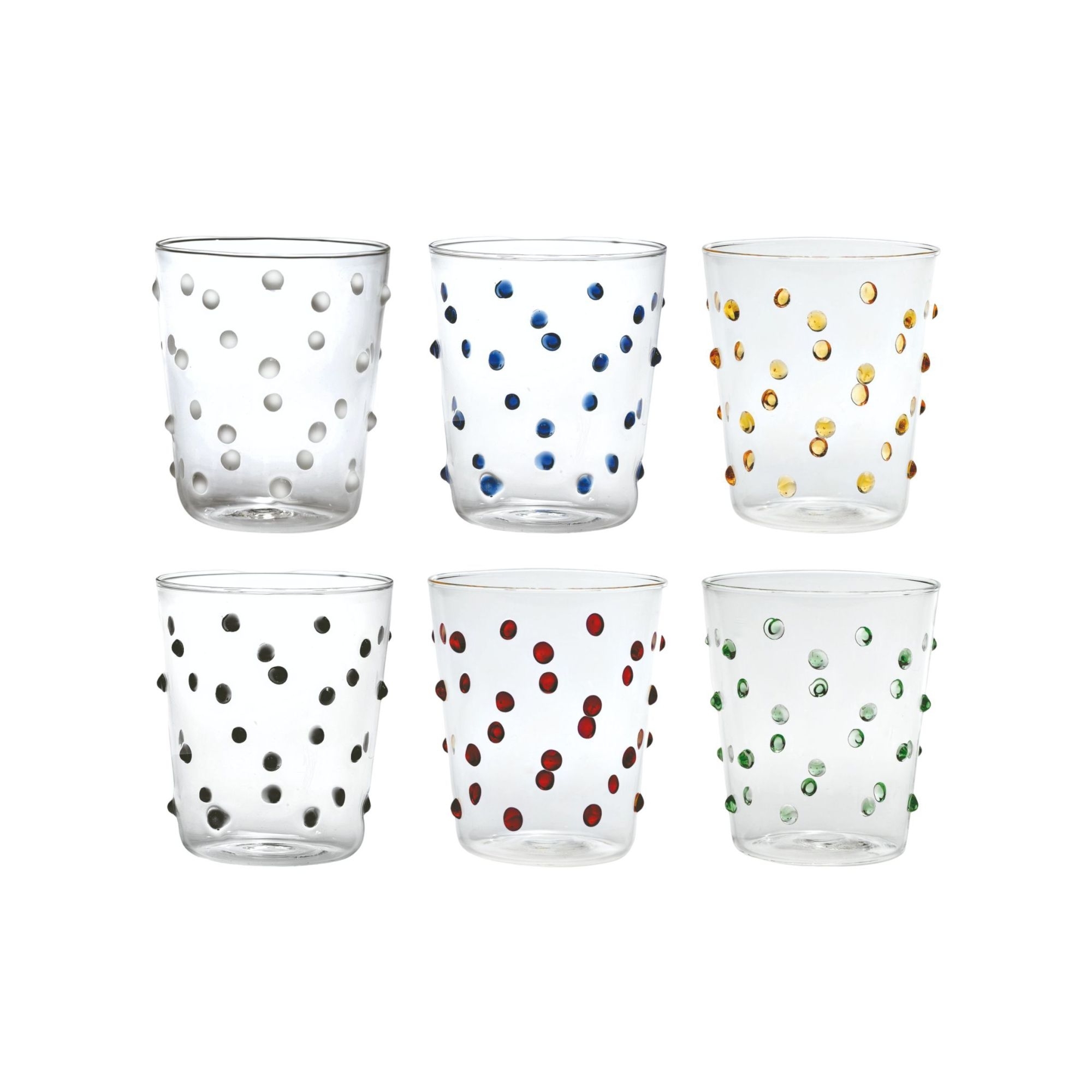 6 Party Junior glasses of 9.5 cl made of handmade borosilicate glass. Assorted in 6 different and elegant color finishes, Party Junior glasses stand out for the extraordinary preciousness of their design: numerous and brilliant sapphires alternate on the surface of each glass, giving a refined style to the whole set. Designed by Federico De Majo for Zafferano.