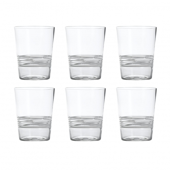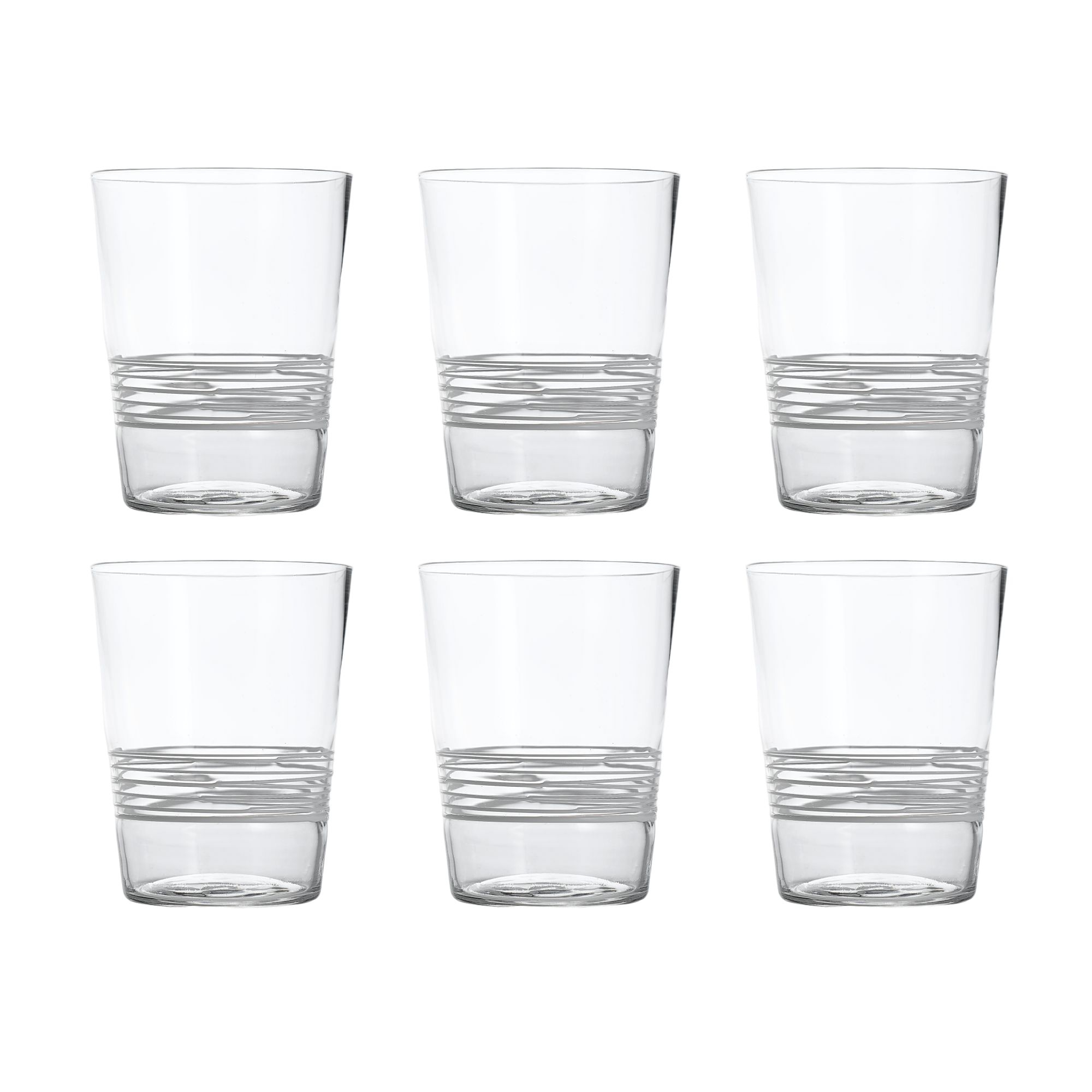 6 glasses of 40 cl, belonging to Filante collection, made of blown and processed glass. Available in 6 elegant color finishes, Filante glasses are perfect to create cheerful and lively table settings. The threads of milky glass applied to the surface of the glasses as well as being a striking decorative element, is also pleasant to the touch. Designed by Federico De Majo for Zafferano.