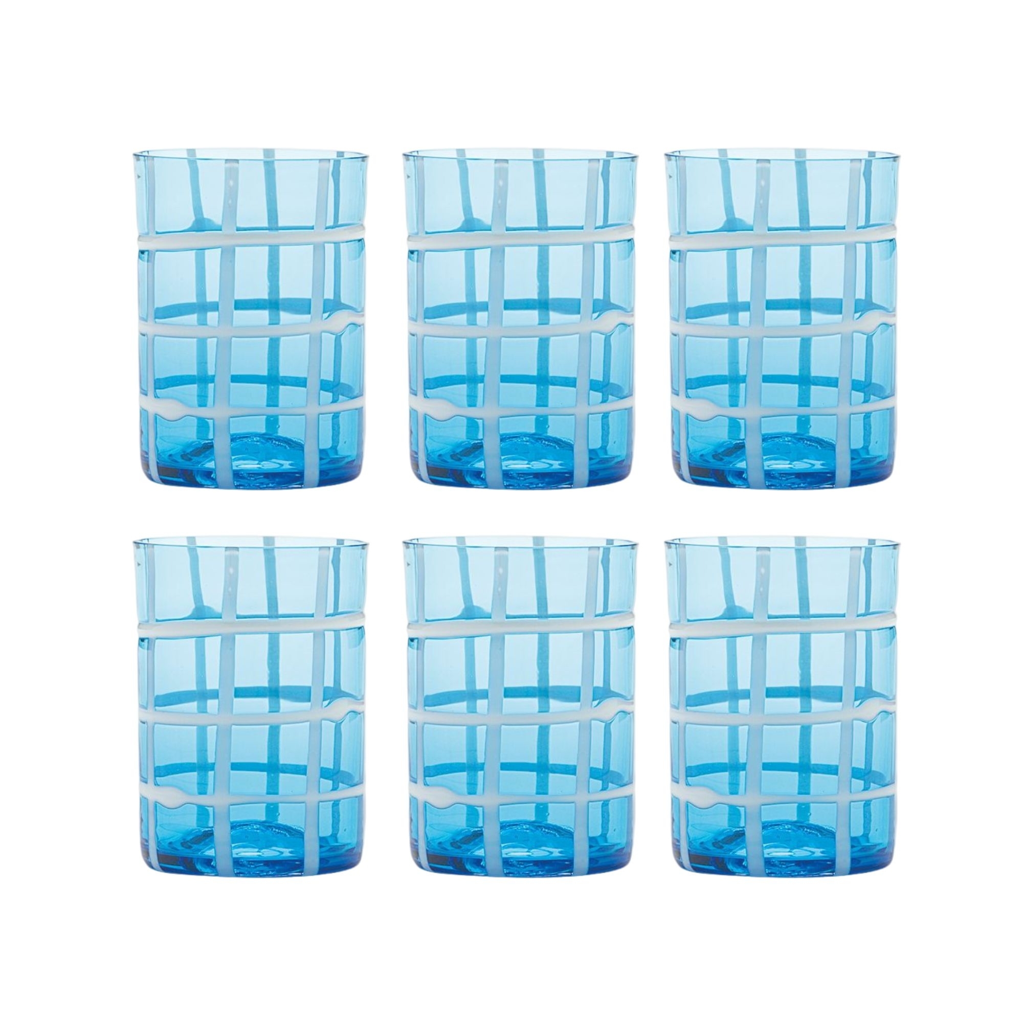 6 glasses of 35 cl, belonging to Twiddle collection, made of hand blown glass. Very elegant in their design and shapes, Twiddle glasses are available in 6 different color finishes and can be easily adapted to any context. The peculiarity of these glasses lies in the motif applied to the surface of the glass, that is, the threads of white paste that make up a pretty network. Designed by Federico De Majo for Zafferano.