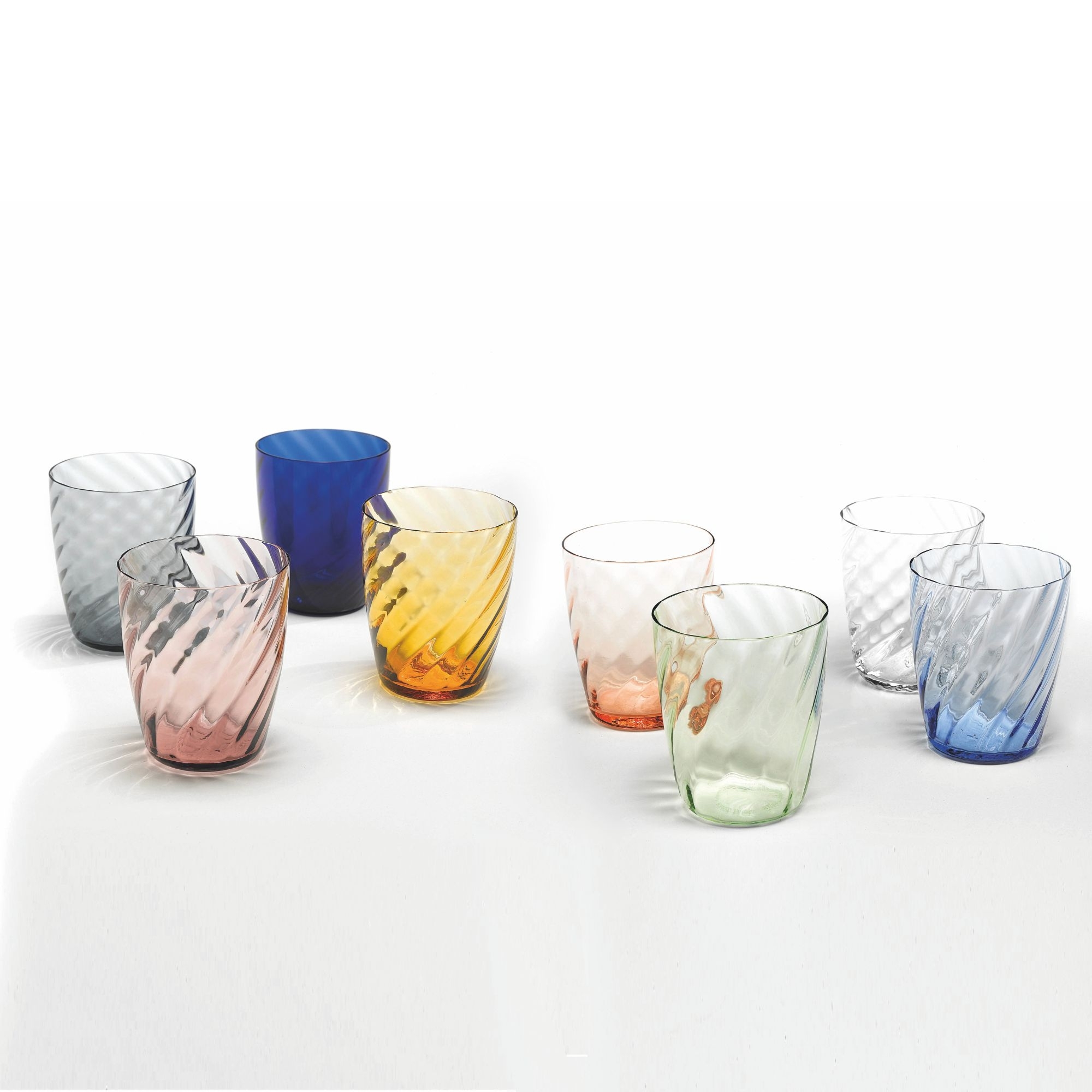 6 glasses of 32 cl, belonging to Torson collection, made of blown glass and handmade. Assorted in 6 elegant and versatile color finishes, Torson glasses are striking for the extraordinary optical effect they can create, given by the relief surface of the glass. Strong and compact, Torson glasses are the best choice for any table setting! Designed by Federico De Majo for Zafferano.