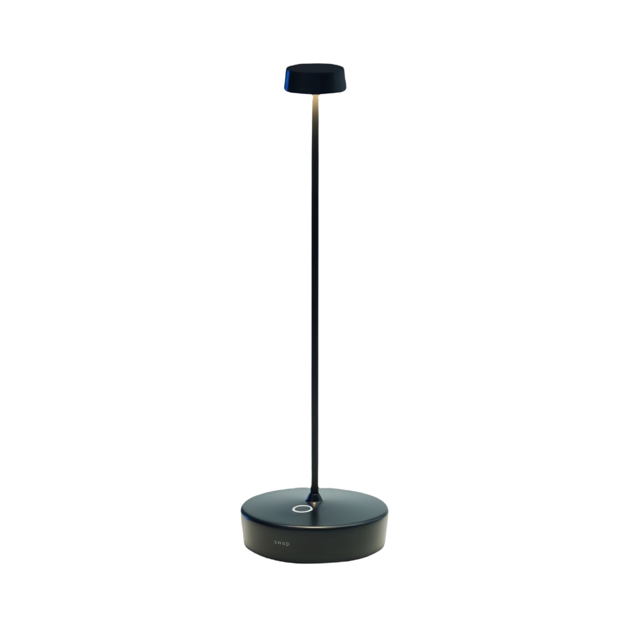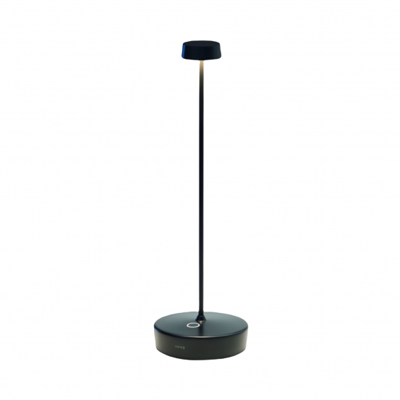 Swap Pro table lamp made with anodized aluminum stem, charging base and polycarbonate diffuser. Available in two finishes, white and black, the Swap lamp features a minimalist yet elegant design. It is dimmable via a touch button, located on the contact base, and the lithium batteries are replaceable. With the light at maximum intensity, the battery lasts about 13 hours, while recharging takes 6 hours. Designed by Federico De Majo for Zafferano.