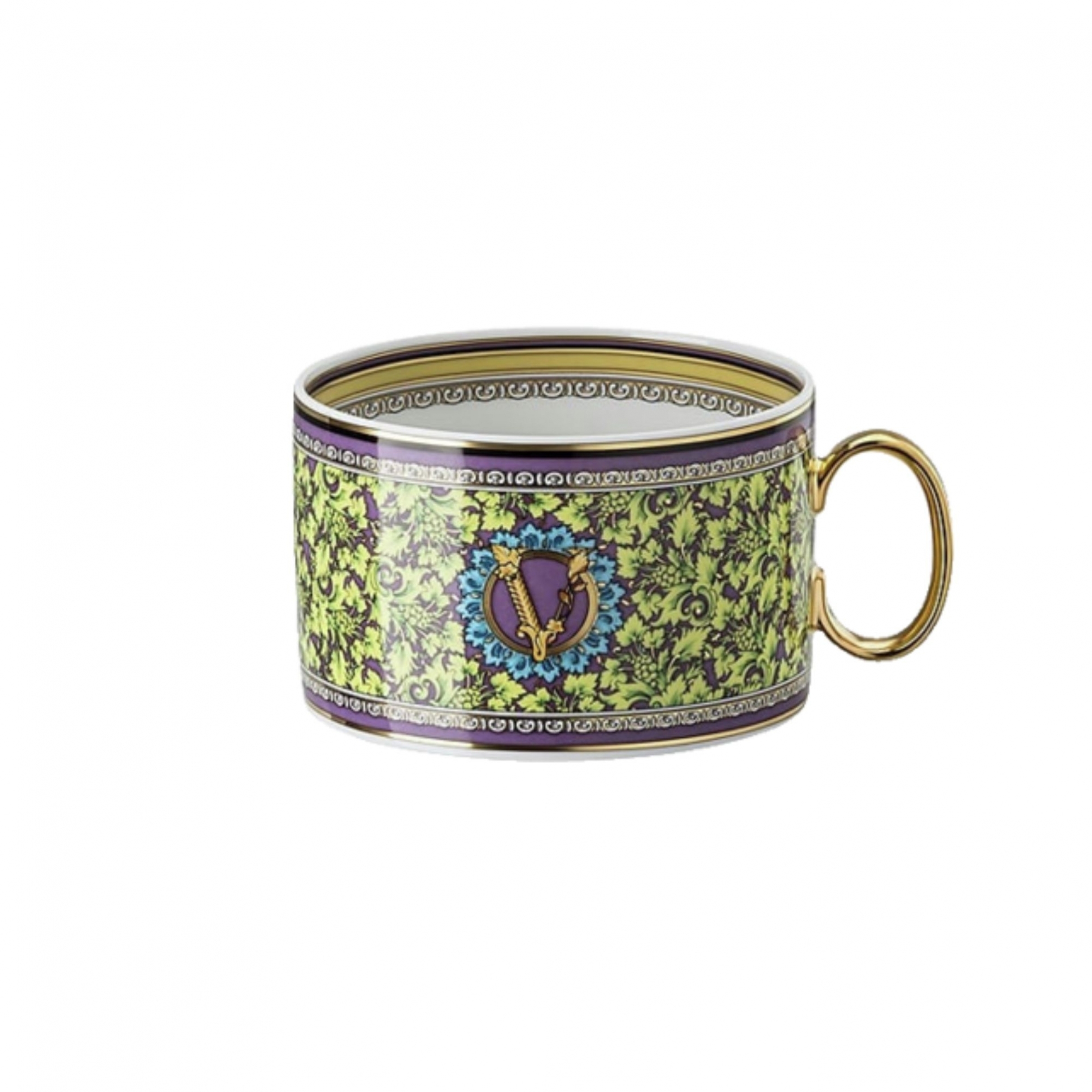 Teacup of 20 cl, belonging to the Barocco Mosaic collection, made of decorated porcelain. Perfect for enjoying afternoon tea time in style, the Barocco Mosaic teacup has a special design, on one side the decorations are mint green and pastel purple, while on the other side they are gold and feature the classic "V" of Versace. This collection brings unique pieces with an all-baroque style to your table! Designed and made by Versace Rosenthal.