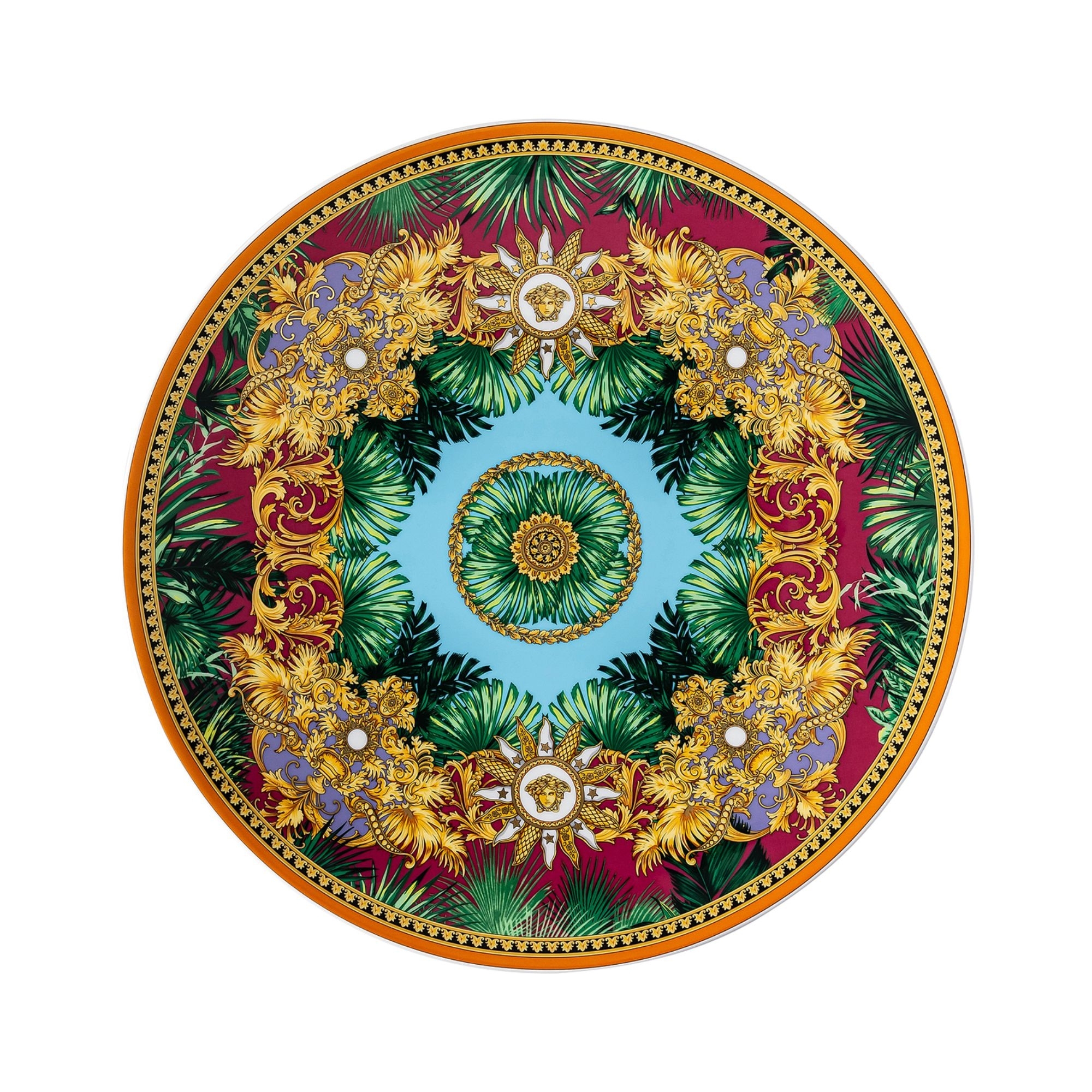 Platter with a diameter of 33 cm, belonging to the Jungle Aminalier collection, made of finely decorated porcelain. The Jungle Animalier plate is adorned with the collection's classic pattern of large leaves and exotic flowers. This platter will give your table a wild touch and make your travel to faraway places! Designed and made by Rosenthal Versace.