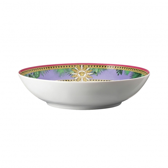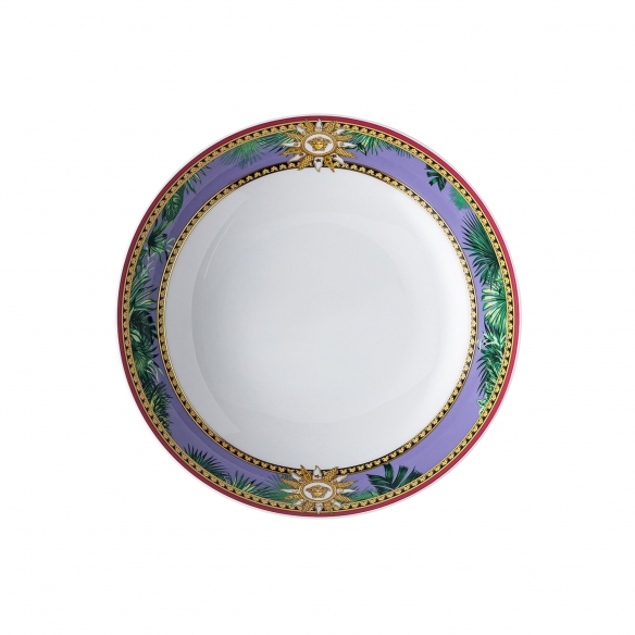 A soup plate with a diameter of 17 cm, belonging to the Jungle Aminalier collection, made of finely decorated porcelain. The Jungle Animalier plate is adorned with the collection's classic pattern of large leaves and exotic flowers. The cherry on top is represented by a small sun enclosing Versace's iconic "Medusa." A perfect accessory for lovers of over-the-top style. This plate will give your table a wild touch and make your travel to faraway places! Designed and made by Rosenthal Versace.