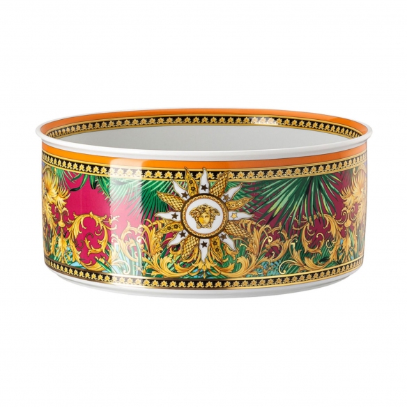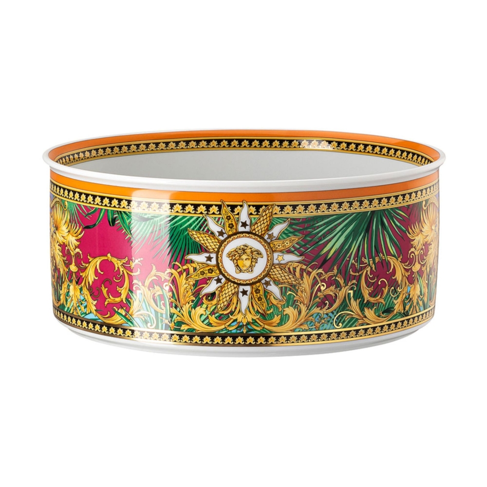 Salad bowl with a diameter of 22 cm, belonging to the Jungle Animalier collection, made of the finest decorated porcelain. Perfect both as a functional table accessory and as an elegant piece of furniture, the Jungle Animalier bowl features a very rich design, full of brilliant colours and striking decorations. The classic golden decorations of the famous fashion house stand out, accompanied by striking designs with leaves and other jungle-inspired details. The cherry on top is represented by the sun enclosing Versace's iconic "Medusa." A perfect accessory for lovers of over-the-top style. Designed and made by Versace Rosenthal.