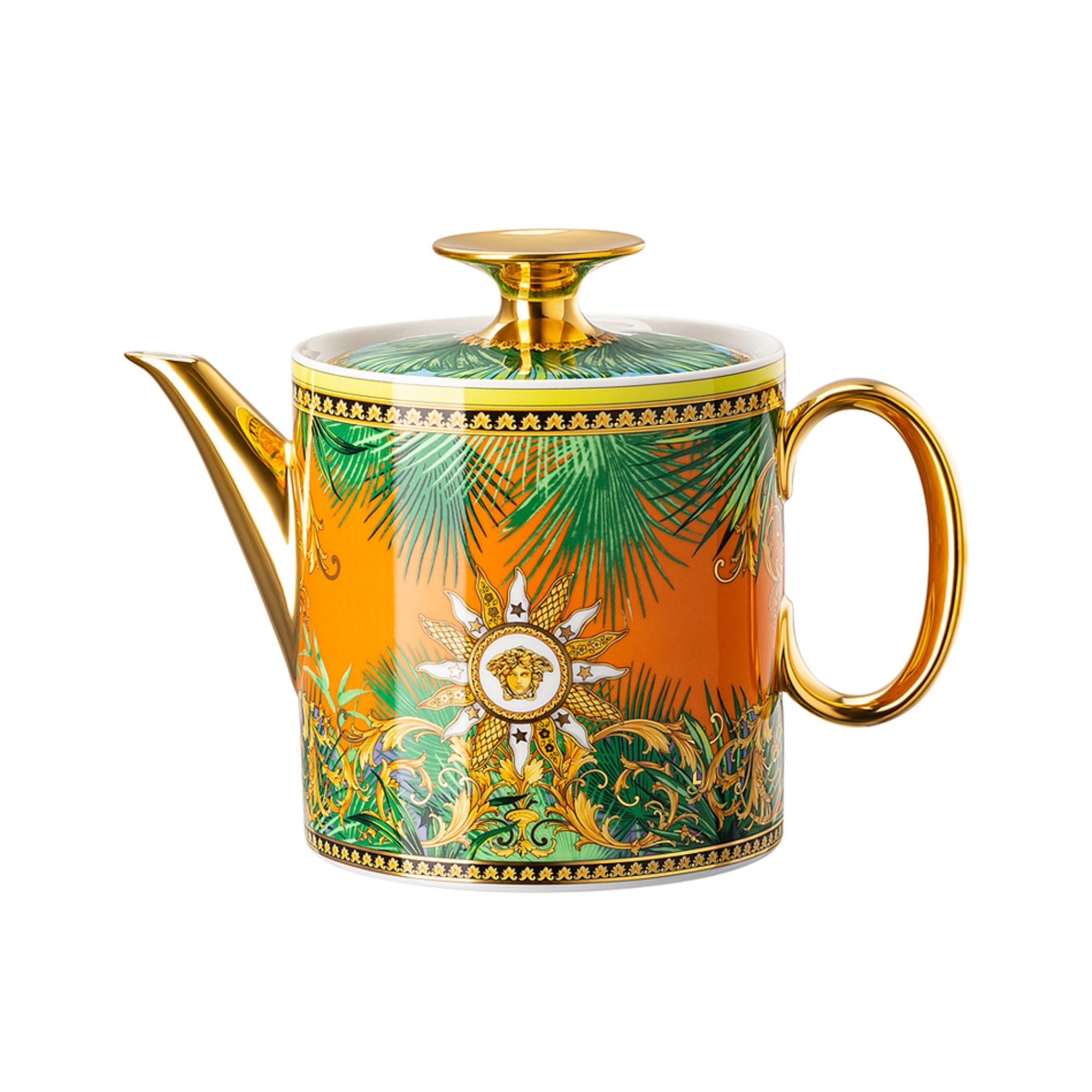 Teapot, belonging to the Jungle Animalier collection, is made of decorated porcelain. The pattern of this wonderful teapot traces the motifs of the Jungle Animalier collection, large palm leaves on a garish orange background. The Jungle Animalier teapot will sweeten your tea breaks, as well as make your travel to exotic, faraway places. Match it with other kitchen accessories from the same collection to complement its aesthetic value. Designed and made by Rosenthal Versace.