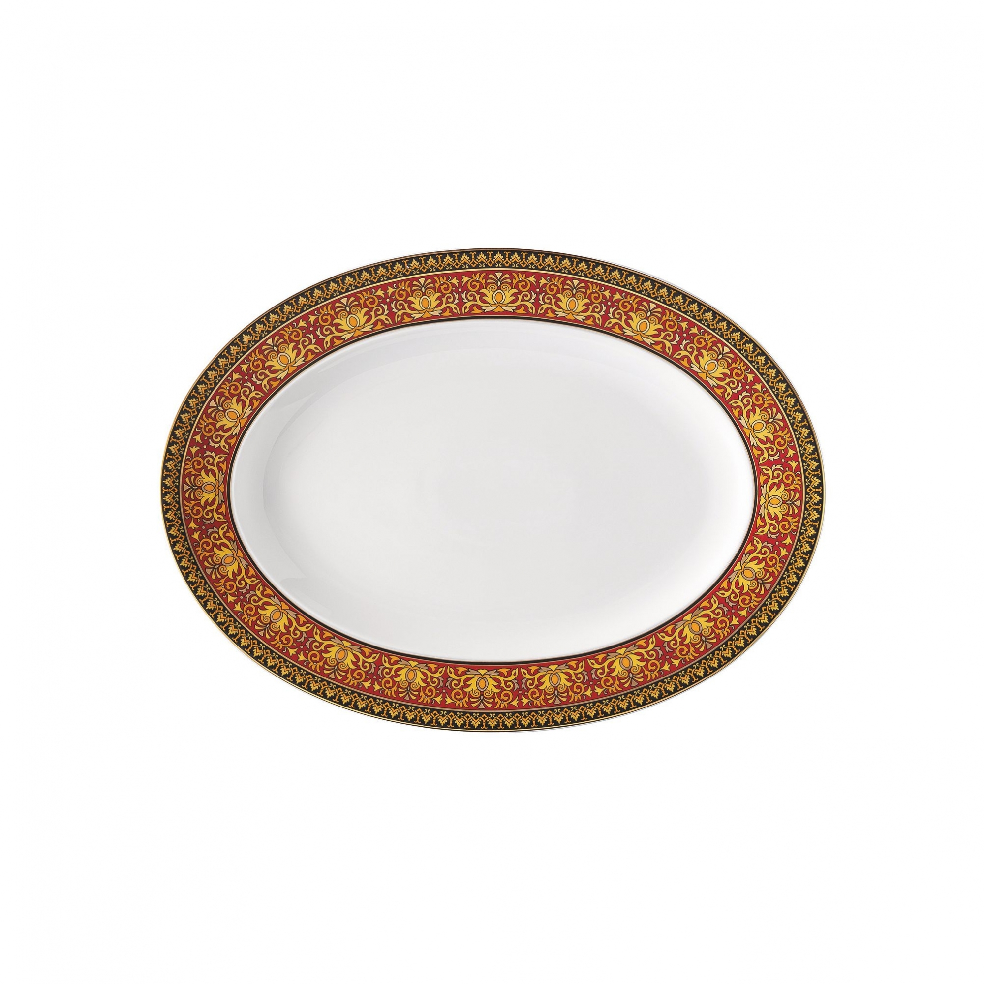 A serving plate with a diameter of 34 cm, belonging to the Medusa collection, made of the finest decorated porcelain. Iconic and refined, the Medusa plate features a luxurious design: the gold and black decorations are intricately woven into a bright red background, able to stand out in any setting. In addition, there is no shortage of antique gold-coloured Baroque borders that make it a very fine piece, a perfect addition to any collection! Designed and made by Rosenthal Versace.