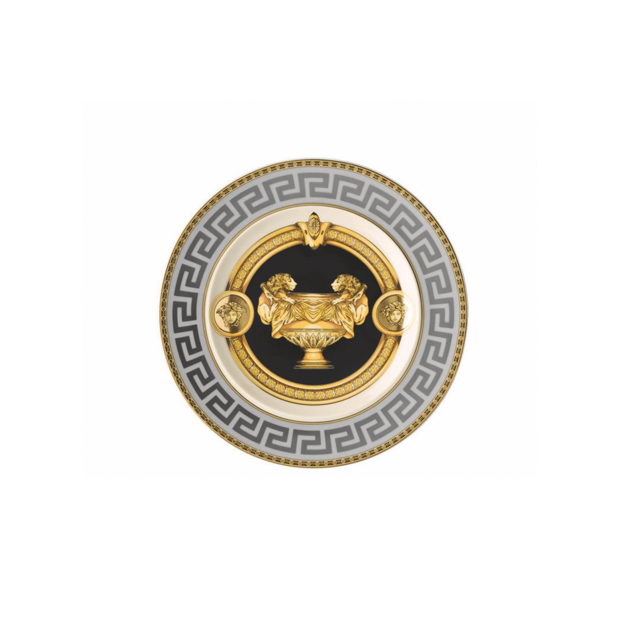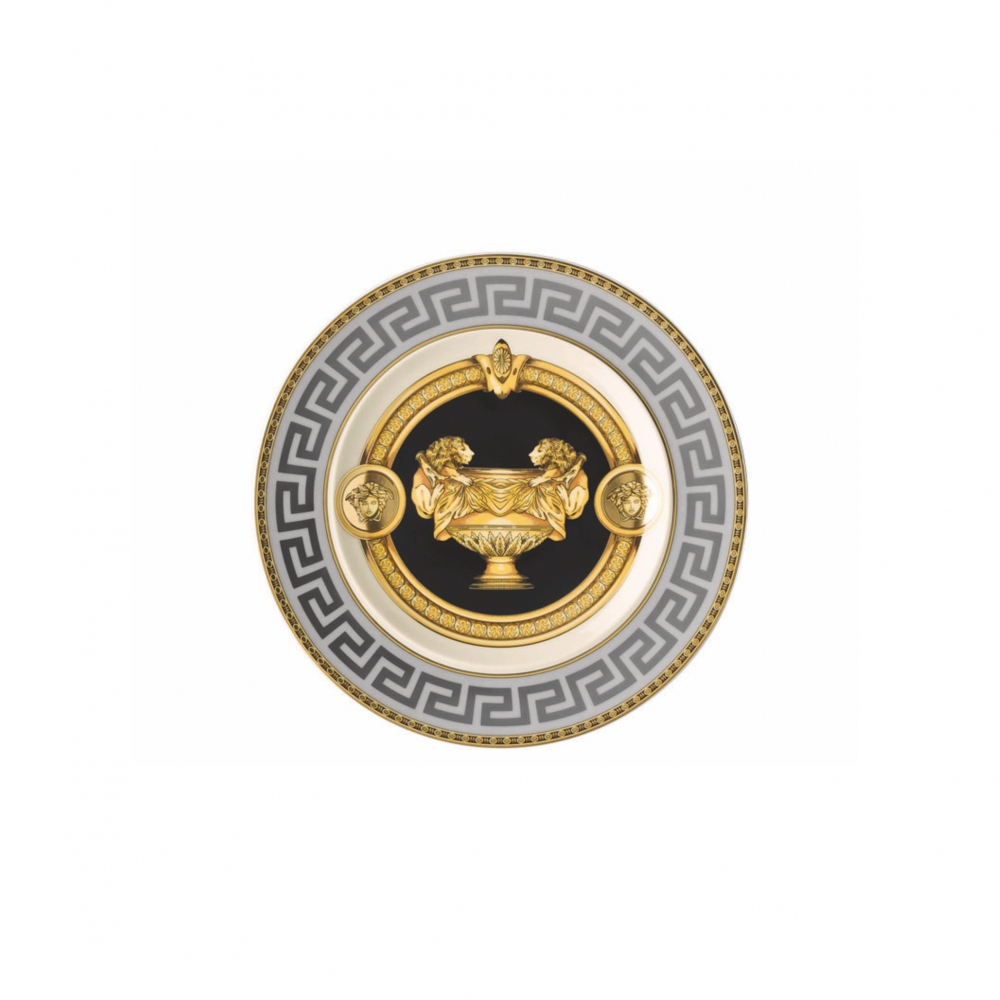 A dinner plate with a diameter of 18 cm, belonging to the Prestige Gala collection, made of the finest decorated porcelain. Enriched by the Prestige Gala decoration, the Prestige Gala dinner plate presents precious elements in the Baroque style, highlighted by a fascinating gold colour and accompanied by classical Greek key motifs. The Prestige Gala plate will dominate your table, brilliant, resistant and indestructible! Made by Rosenthal Versace.