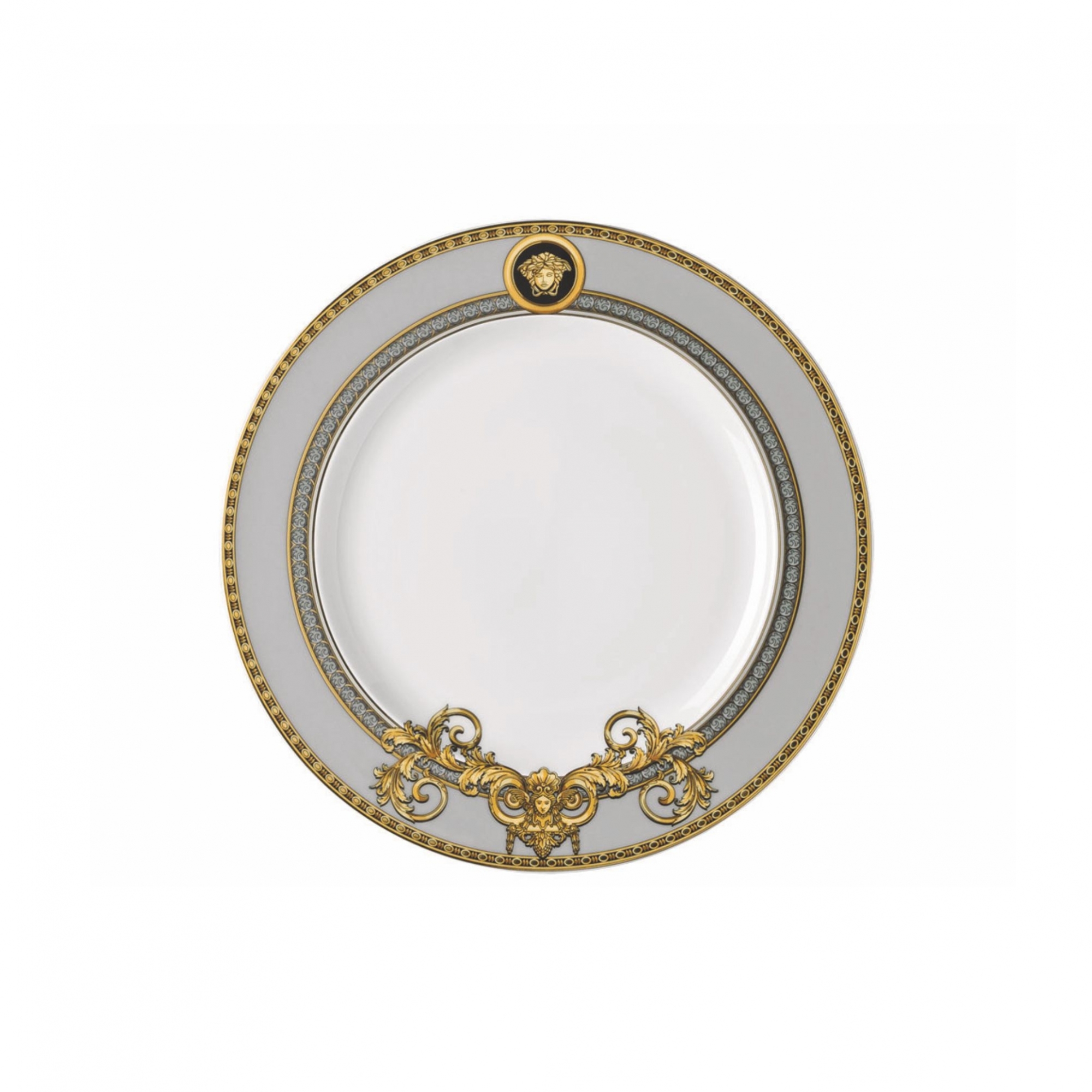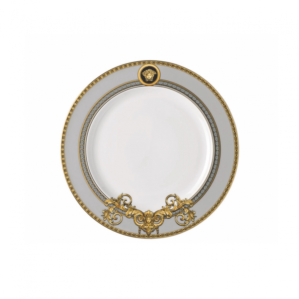 A dinner plate with a diameter of 22 cm, belonging to the Prestige Gala collection, made of the finest decorated porcelain. Enriched with the Prestige Gala 1 decoration, the Prestige Gala dinner plate features precious elements in Baroque style, highlighted by fascinating golden details and accompanied by classical Greek key motifs, such as the iconic Medusa head. The Prestige Gala plate will dominate your table, bright, resistant and indestructible! Manufactured by Rosenthal Versace.