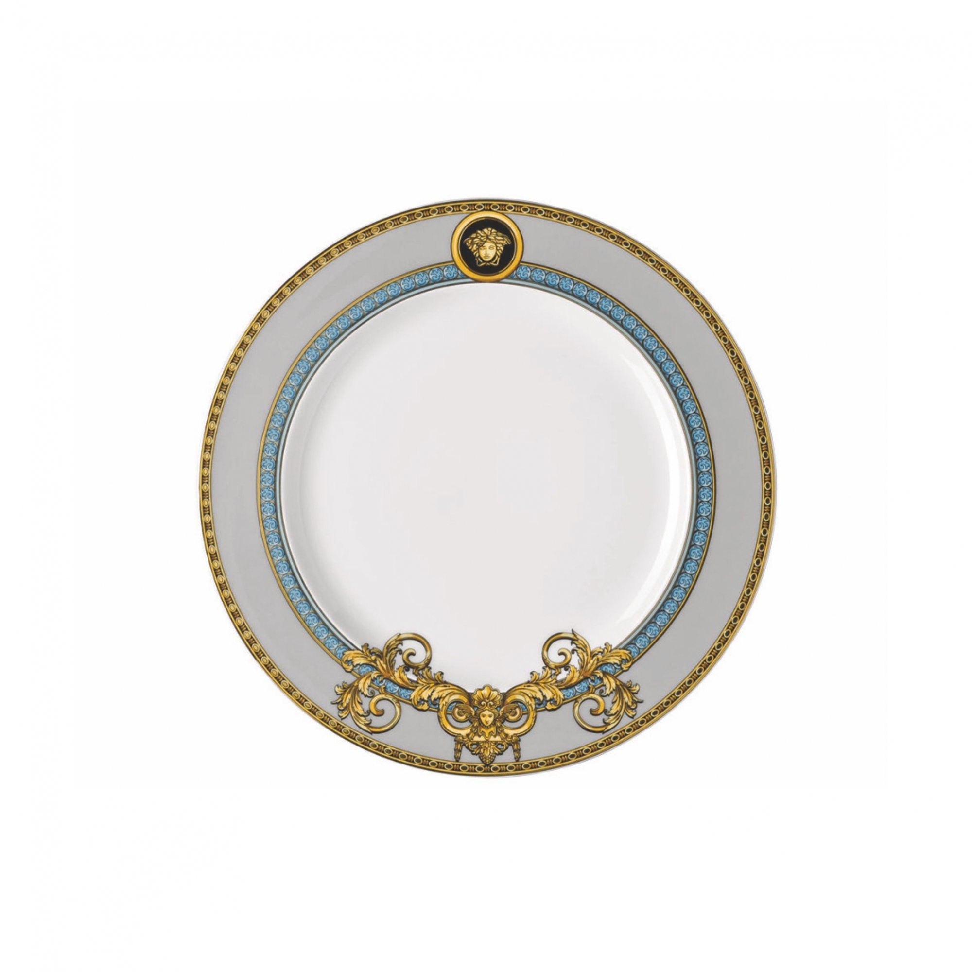 A flat plate with a diameter of 22 cm, belonging to the Prestige Gala collection, made of the finest decorated porcelain. Enriched with the Prestige Gala Le Bleu decoration, the Prestige Gala dinner plate features precious elements in the Baroque style, highlighted by fascinating details in gold and blue, and accompanied by classical Greek key motifs, such as the iconic Medusa head. The Prestige Gala plate will dominate your table, brilliant, resistant and indestructible! Made by Rosenthal Versace.